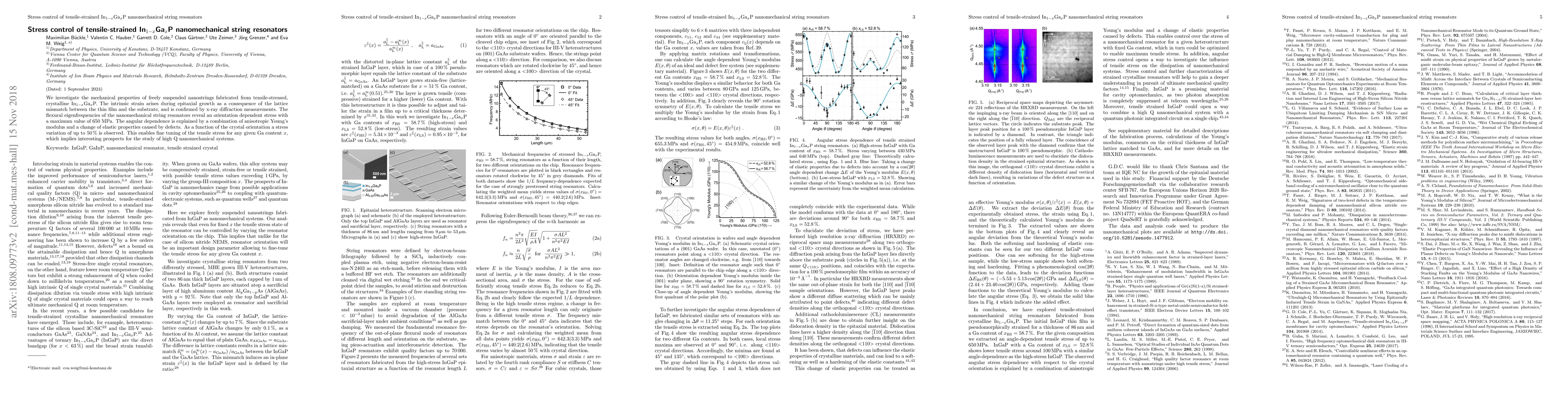 We investigate the mechanical properties of freely suspended nanostrings fabricated from tensile-stressed, crystalline In$_{1-x}$Ga$_{x}$P. The intrinsic strain is a consequence of the epitaxial growth given by the lattice mismatch between the thin film and the substrate which is confirmed by x-ray diffraction measurements. The flexural eigenfrequencies of the nanomechanical string resonators reveal an orientation dependent stress with a maximum value of 650 MPa. The angular dependence is explained by a combination of anisotropic Young's modulus and a change of elastic properties caused by defects. As a function of the crystal orientation a stress variation of up to 50 % is observed. This enables fine tuning of the tensile stress for any given Ga content $x$, which implies interesting prospects for the study of high Q nanomechanical systems.