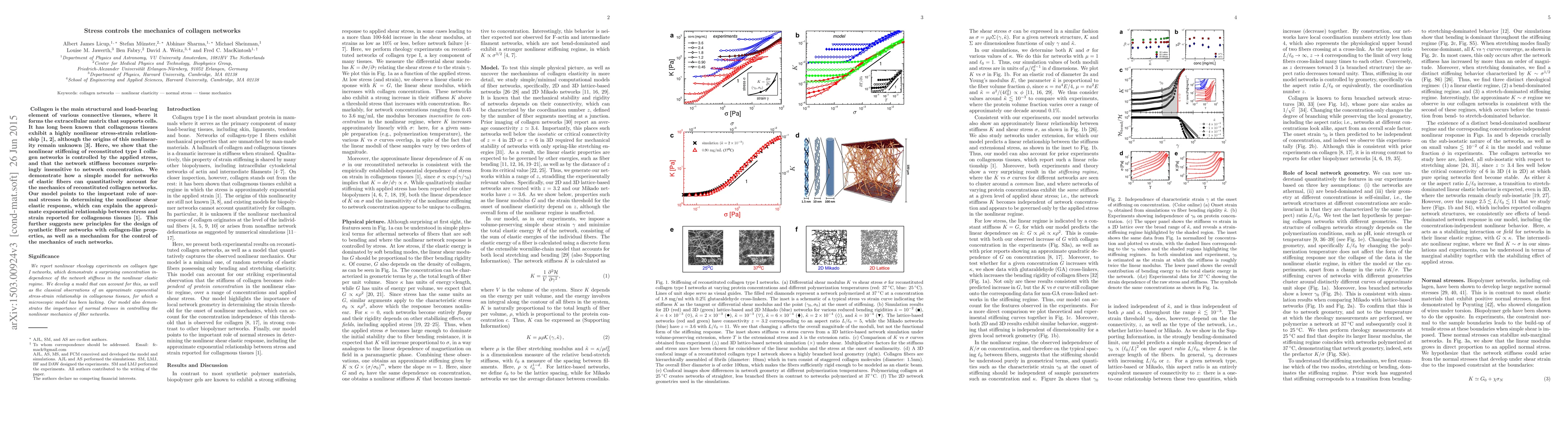 This paper demonstrates that the nonlinear stiffening of reconstituted type I collagen networks is governed by applied stress, revealing that network stiffness is largely stress-dependent rather than concentration-dependent. A proposed model highlights the role of normal stresses in the nonlinear shear elastic response, offering insights into collagen mechanics and potential applications in synthetic fiber network design.