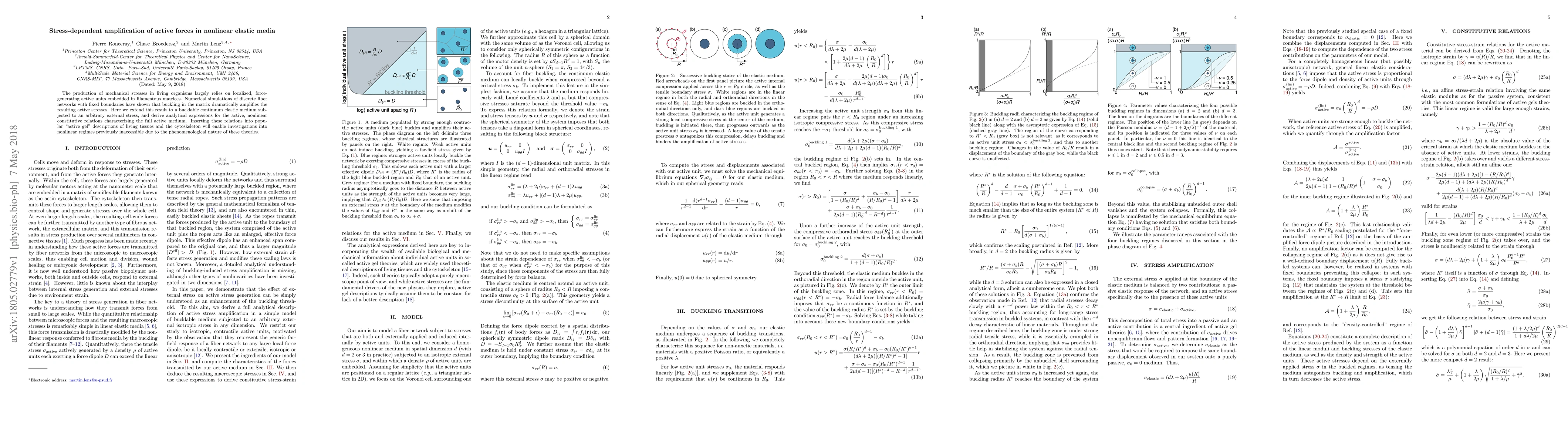 The production of mechanical stresses in living organisms largely relies on localized, force-generating active units embedded in filamentous matrices. Numerical simulations of discrete fiber networks with fixed boundaries have shown that buckling in the matrix dramatically amplifies the resulting active stresses. Here we extend this result to a bucklable continuum elastic medium subjected to an arbitrary external stress, and derive analytical expressions for the active, nonlinear constitutive relations characterizing the full active medium. Inserting these relations into popular "active gel" descriptions of living tissues and the cytoskeleton will enable investigations into nonlinear regimes previously inaccessible due to the phenomenological nature of these theories.