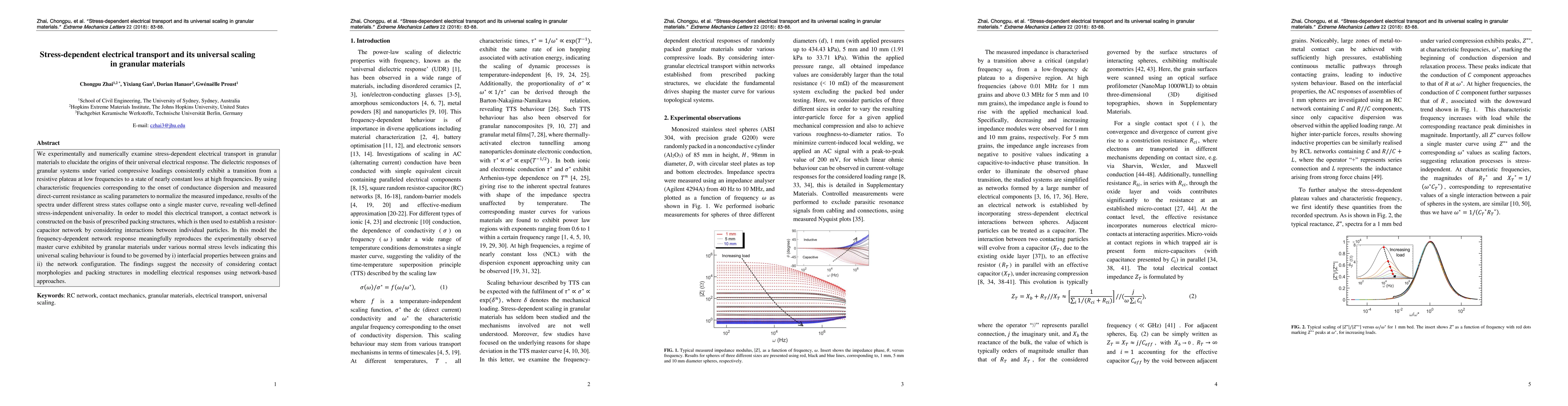 This study investigates stress-dependent electrical transport in granular materials, revealing a universal scaling behavior that collapses diverse stress states onto a single master curve. The findings highlight that the dielectric response is governed by interfacial properties and the network configuration, emphasizing the importance of contact morphologies and packing structures in modeling electrical responses.