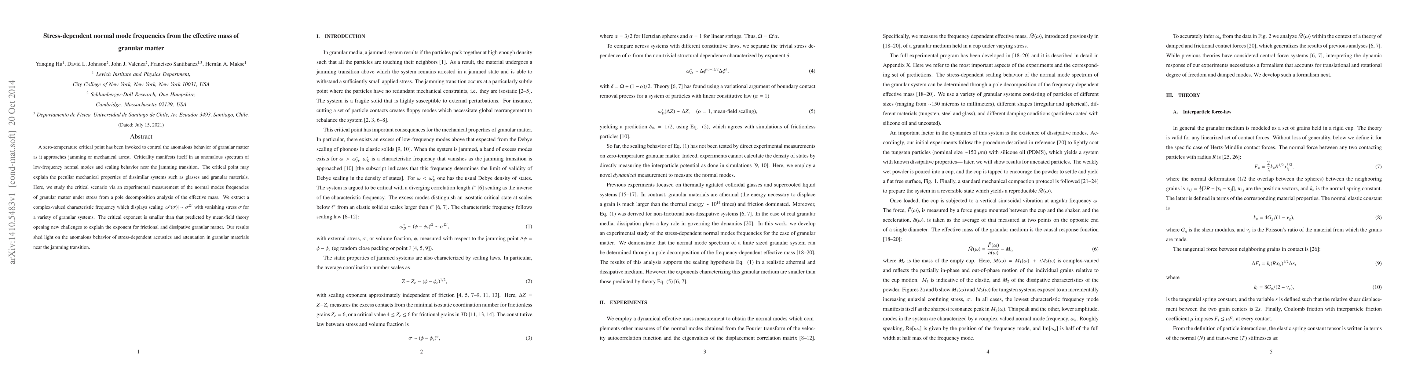 This study experimentally measures the normal mode frequencies of granular matter under stress, revealing a scaling behavior near the jamming transition that challenges mean-field theory predictions. The findings provide insights into the anomalous mechanical properties of granular materials and stress-dependent acoustics.