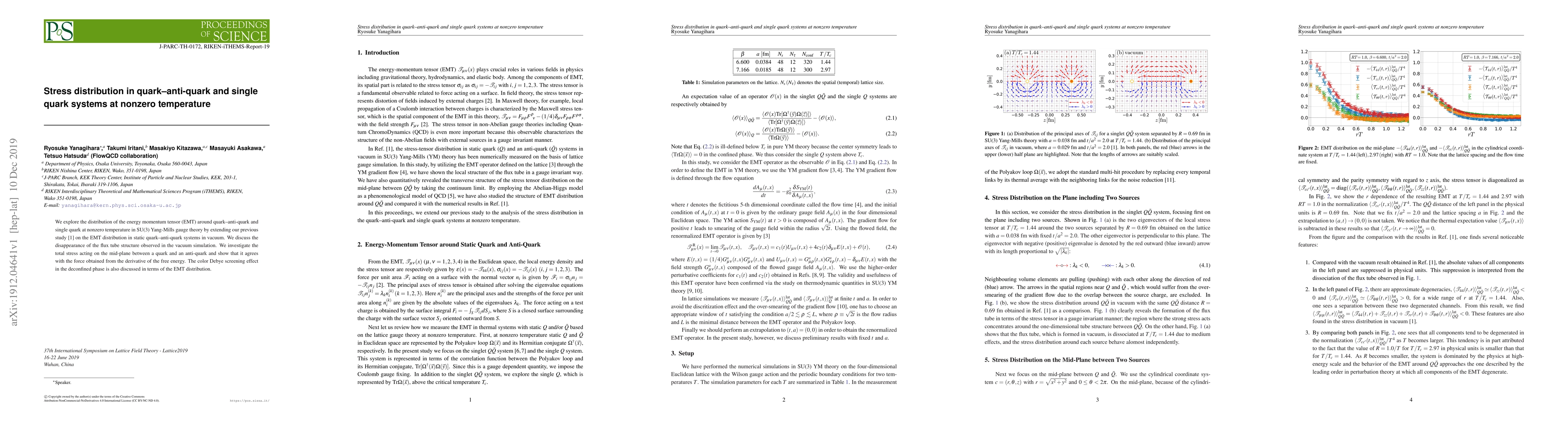 This paper investigates the energy momentum tensor distribution in quark-anti-quark and single quark systems at nonzero temperatures in SU(3) Yang-Mills theory, revealing the disappearance of flux tube structures and the effects of color Debye screening in the deconfined phase. The study confirms that the stress on the mid-plane aligns with the force derived from the free energy derivative.