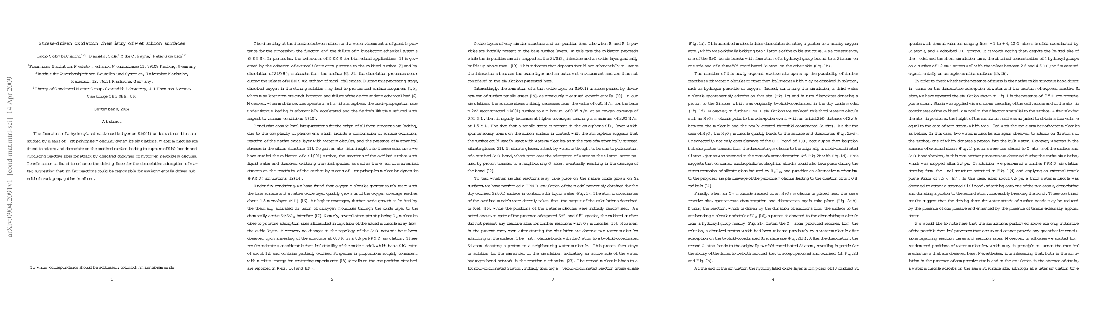 The formation of a hydroxylated native oxide layer on Si(001) under wet conditions is studied by means of first principles molecular dynamics simulations. Water molecules are found to adsorb and dissociate on the oxidised surface leading to rupture of Si-O bonds and producing reactive sites for attack by dissolved dioxygen or hydrogen peroxide molecules. Tensile strain is found to enhance the driving force for the dissociative adsorption of water, suggesting that similar reactions could be responsible for environmentally-driven sub-critical crack propagation in silicon.