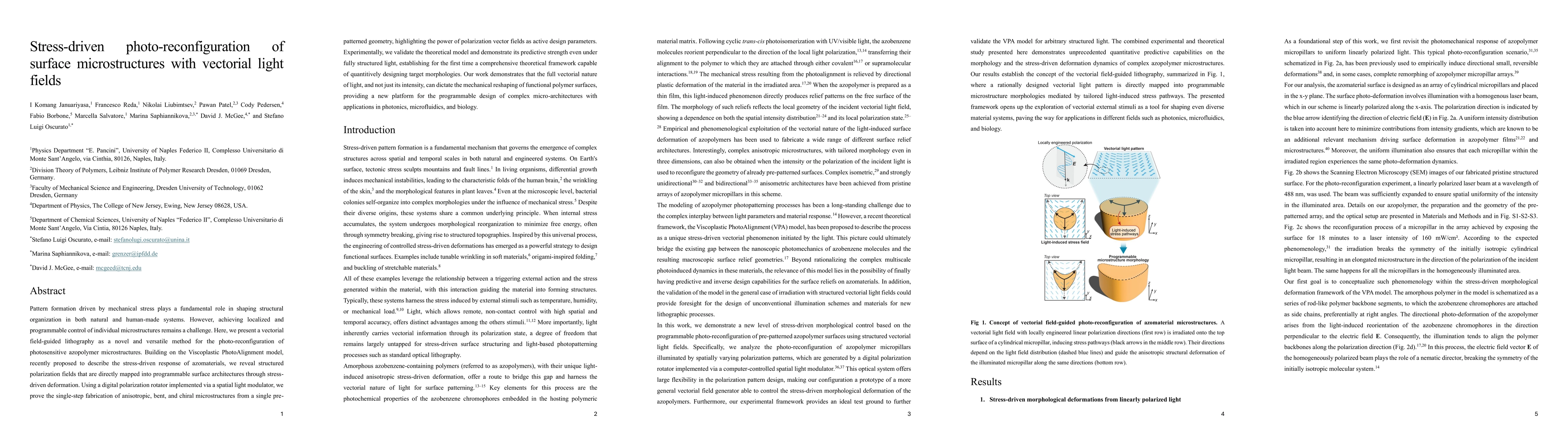 Pattern formation driven by mechanical stress plays a fundamental role in shaping structural organization in both natural and human-made systems. However, achieving localized and programmable control of individual microstructures remains a challenge. Here, we present a vectorial field-guided lithography as a novel and versatile method for the photo-reconfiguration of photosensitive azopolymer microstructures. Building on the Viscoplastic PhotoAlignment model, recently proposed to describe the stress-driven response of azomaterials, we reveal structured polarization fields that are directly mapped into programmable surface architectures through stress-driven deformation. Using a digital polarization rotator implemented via a spatial light modulator, we prove the single-step fabrication of anisotropic, bent, and chiral microstructures from a single pre-patterned geometry, highlighting the power of polarization vector fields as active design parameters. Experimentally, we validate the theoretical model and demonstrate its predictive strength even under fully structured light, establishing for the first time a comprehensive theoretical framework capable of quantitively designing target morphologies. Our work demonstrates that the full vectorial nature of light, and not just its intensity, can dictate the mechanical reshaping of functional polymer surfaces, providing a new platform for the programmable design of complex micro-architectures with applications in photonics, microfluidics, and biology.