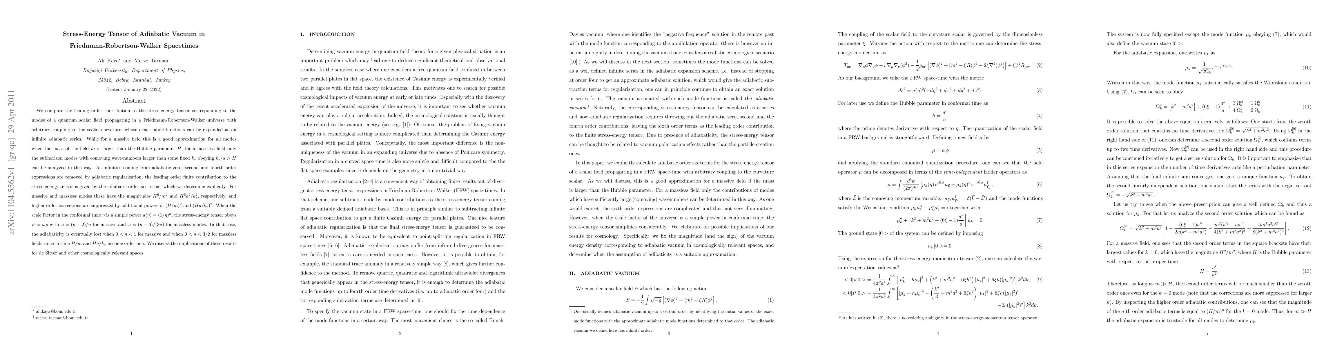This paper computes the leading order stress-energy tensor for a quantum scalar field in a Friedmann-Robertson-Walker universe, showing that adiabatic regularization removes infinities. The tensor's magnitude depends on the field's mass relative to the Hubble parameter, with implications for cosmological models like de Sitter space.