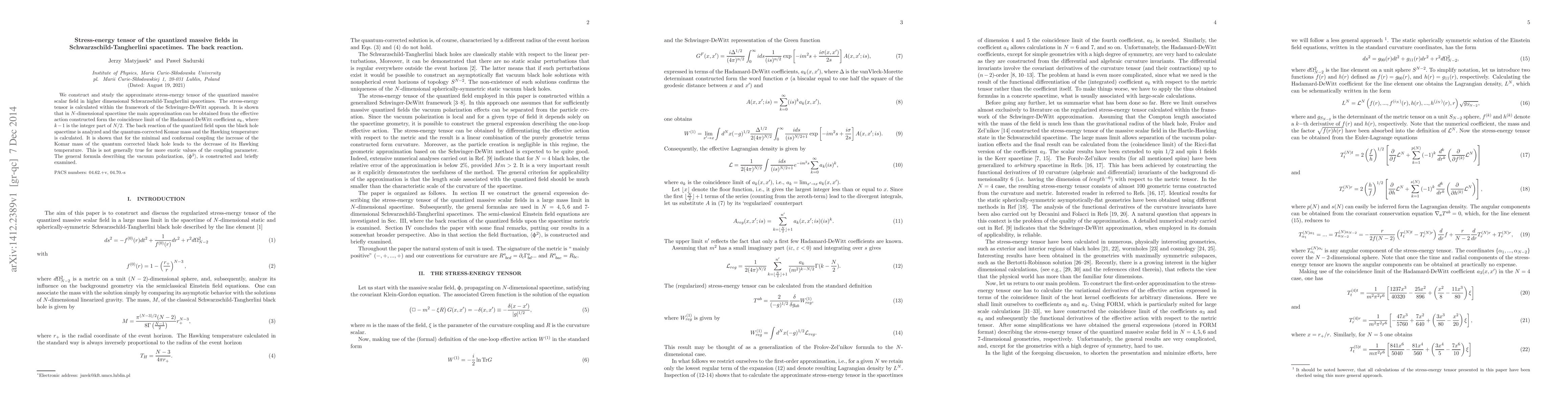 We construct and study the approximate stress-energy tensor of the quantized massive scalar field in higher dimensional Schwarzschild-Tangherlini spacetimes. The stress-energy tensor is calculated within the framework of the Schwinger-DeWitt approach. It is shown that in $N$-dimensional spacetime the main approximation can be obtained from the effective action constructed form the coincidence limit of the Hadamard-DeWitt coefficient $a_{k},$ where $k-1$ is the integer part of $N/2$. The back reaction of the quantized field upon the black hole spacetime is analyzed and the quantum-corrected Komar mass and the Hawking temperature is calculated. It is shown that for the minimal and conformal coupling the increase of the Komar mass of the quantum corrected black hole leads to the decrease of its Hawking temperature. This is not generally true for more exotic values of the coupling parameter. The general formula describing the vacuum polarization, $ \langle \phi^{2} \rangle,$ is constructed and briefly examined.