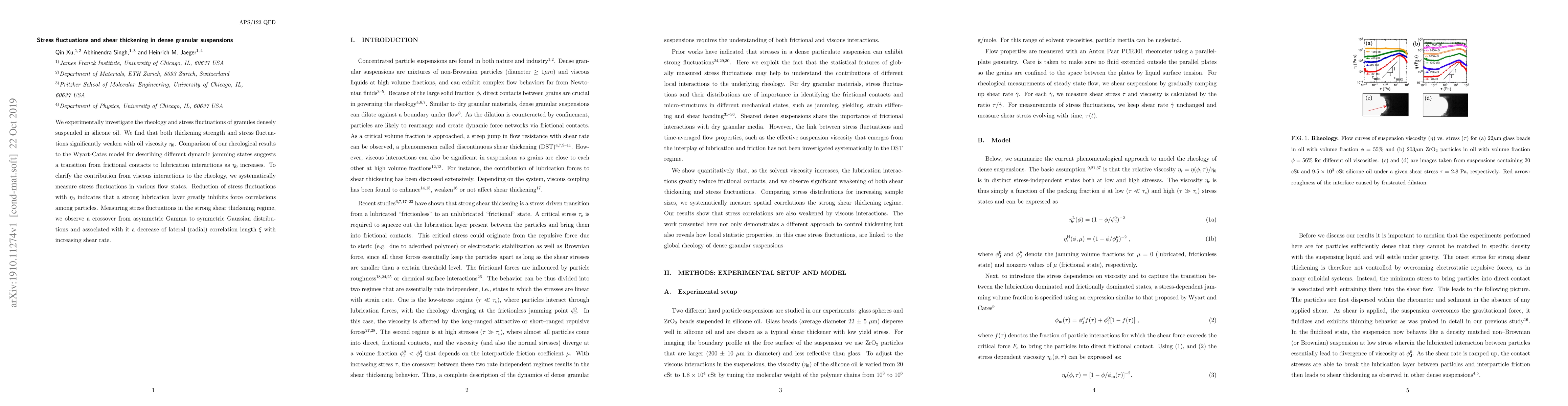 We experimentally investigate the rheology and stress fluctuations of granules densely suspended in silicone oil. We find that both thickening strength and stress fluctuations significantly weaken with oil viscosity $\eta_0$. Comparison of our rheological results to the Wyart-Cates model for describing different dynamic jamming states suggests a transition from frictional contacts to lubrication interactions as $\eta_0$ increases. To clarify the contribution from viscous interactions to the rheology, we systematically measure stress fluctuations in various flow states. Reduction of stress fluctuations with $\eta_0$ indicates that a strong lubrication layer greatly inhibits force correlations among particles. Measuring stress fluctuations in the strong shear thickening regime, we observe a crossover from asymmetric Gamma to symmetric Gaussian distributions and associated with it a decrease of lateral (radial) correlation length $\xi$ with increasing shear rate.