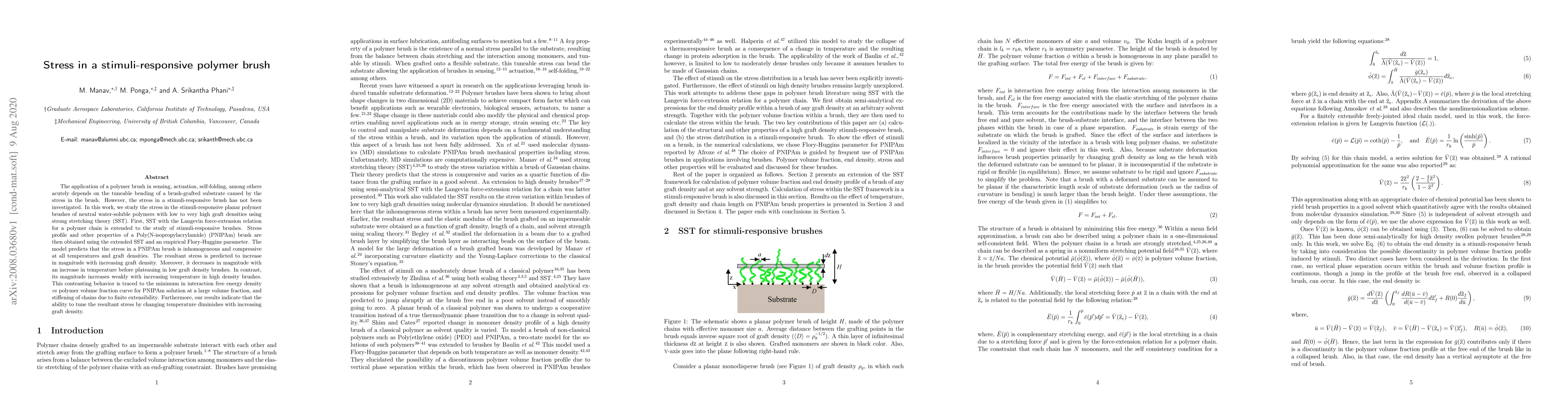 The study investigates stress in stimuli-responsive polymer brushes, revealing that it is compressive and increases with graft density, while temperature changes its magnitude in low and high density brushes.