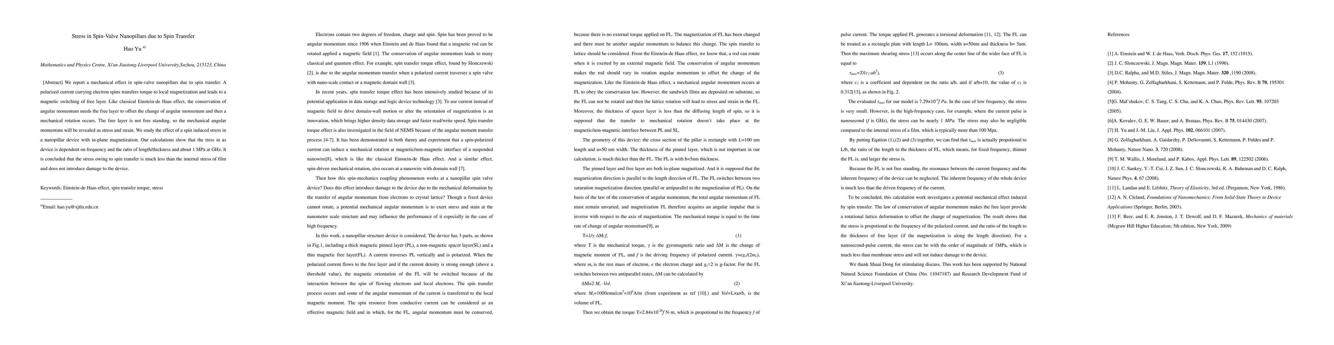 We report a mechanical effect in spin-valve nanopillars due to spin transfer. A polarized current carrying electron spins transfers torque to local magnetization and leads to a magnetic switching of free layer. Like classical Einstein-de Haas effect, the conservation of angular momentum needs the free layer to offset the change of angular momentum and then a mechanical rotation occurs. The free layer is not free standing, so the mechanical angular momentum will be revealed as stress and strain. We study the effect of a spin induced stress in a nanopillar device with in-plane magnetization. Our calculations show that the tress in as device is dependent on frequency and the ratio of length/thickness and about 1 MPa at GHz. It is concluded that the stress owing to spin transfer is much less than the internal stress of film and does not introduce damage to the device.