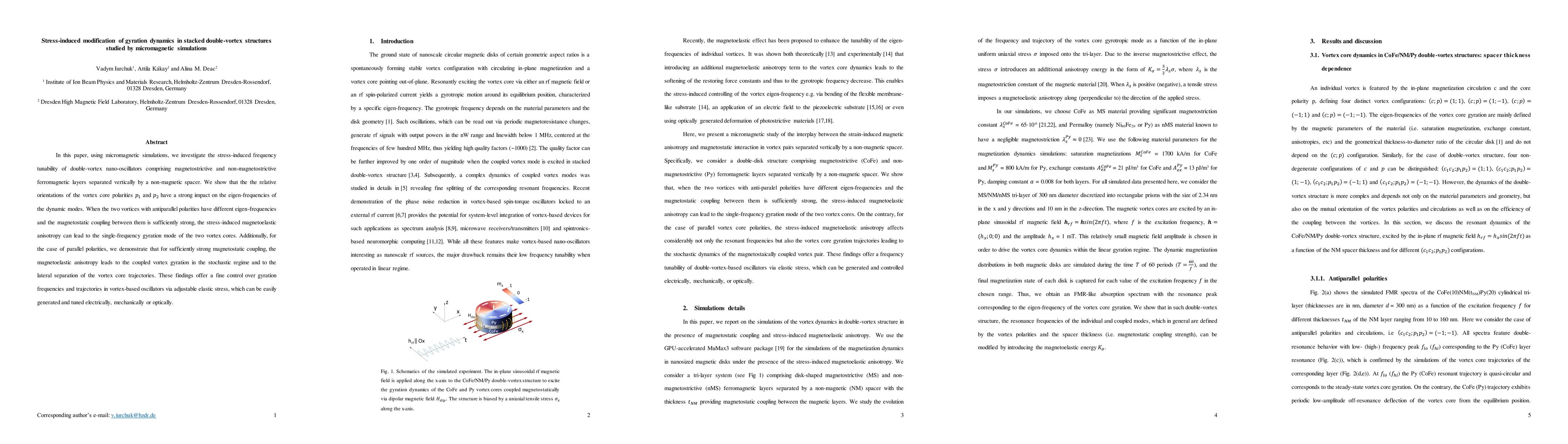 This research uses micromagnetic simulations to explore how stress affects the gyration dynamics in stacked double-vortex structures, revealing that stress-induced magnetoelastic anisotropy can tune the eigen-frequencies and trajectories of vortex cores, enabling precise control over oscillator performance.