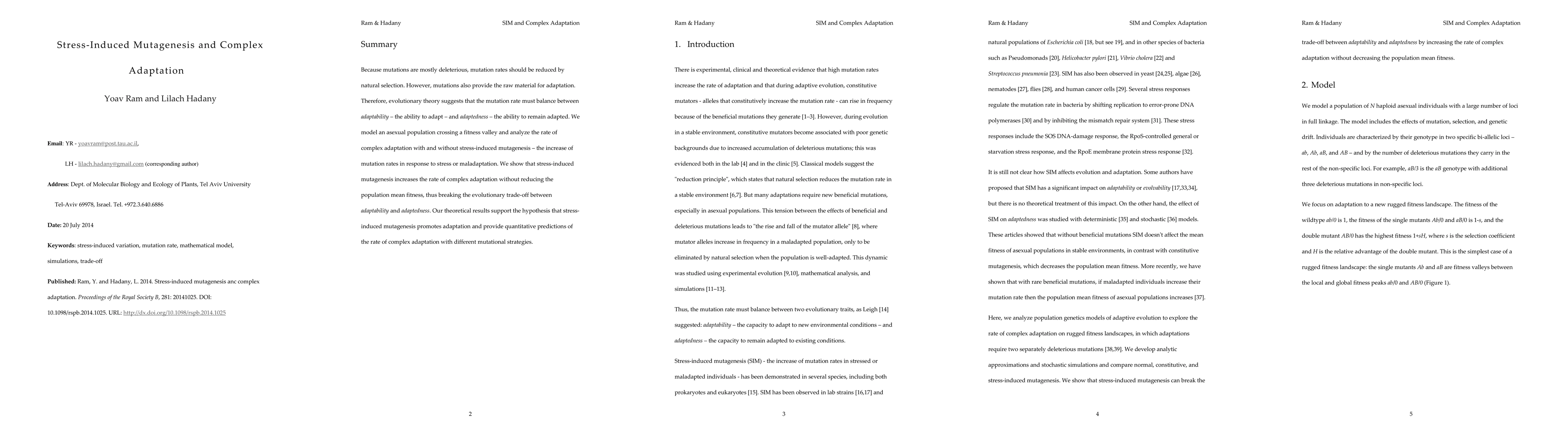 This paper models an asexual population navigating a fitness valley, demonstrating that stress-induced mutagenesis enhances complex adaptation without lowering population mean fitness, thereby overcoming the traditional evolutionary trade-off between adaptability and adaptedness. The findings support the hypothesis that increased mutation rates during stress can promote adaptation.