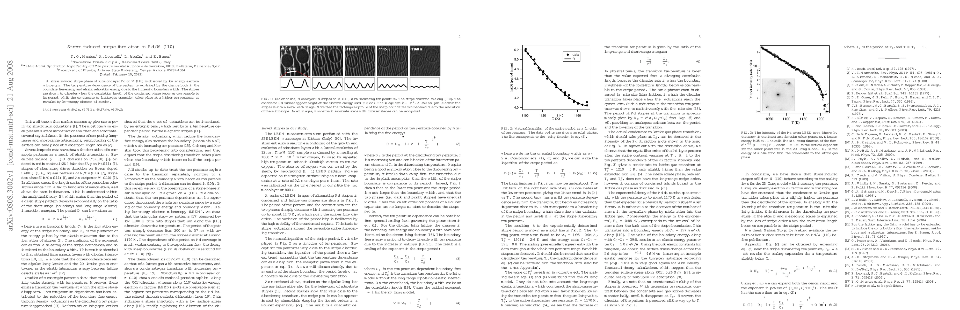 The research observes a stress-induced stripe pattern on Pd/W(110) using low-energy electron microscopy. The pattern's temperature dependence is explained by changes in boundary and elastic energies, with stripes disordering as their correlation length matches the period. Low-energy electron diffraction reveals a higher temperature for the condensate to lattice-gas transition.
