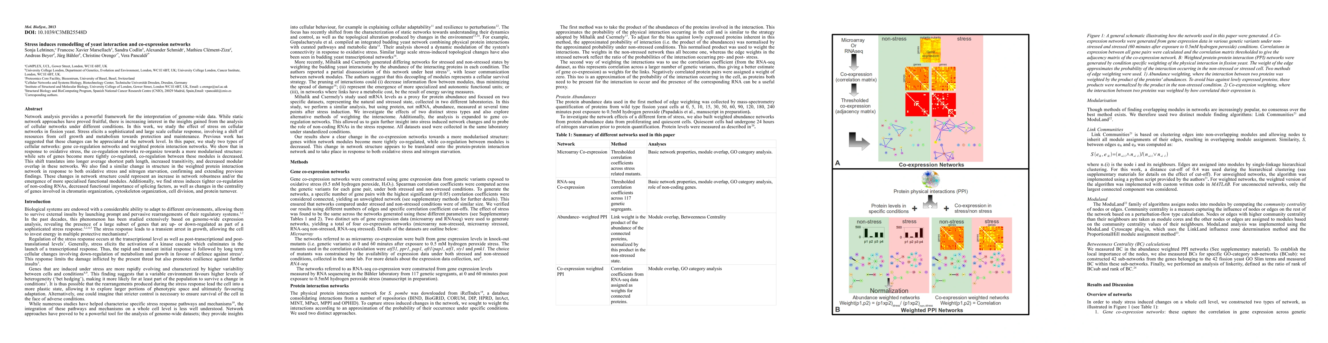 This paper investigates how stress induces significant reorganisation in fission yeast's gene co-regulation and protein interaction networks, revealing a shift towards more modular structures and increased network robustness. The findings suggest specialised functional modules and changes in the centrality of genes involved in critical cellular processes.