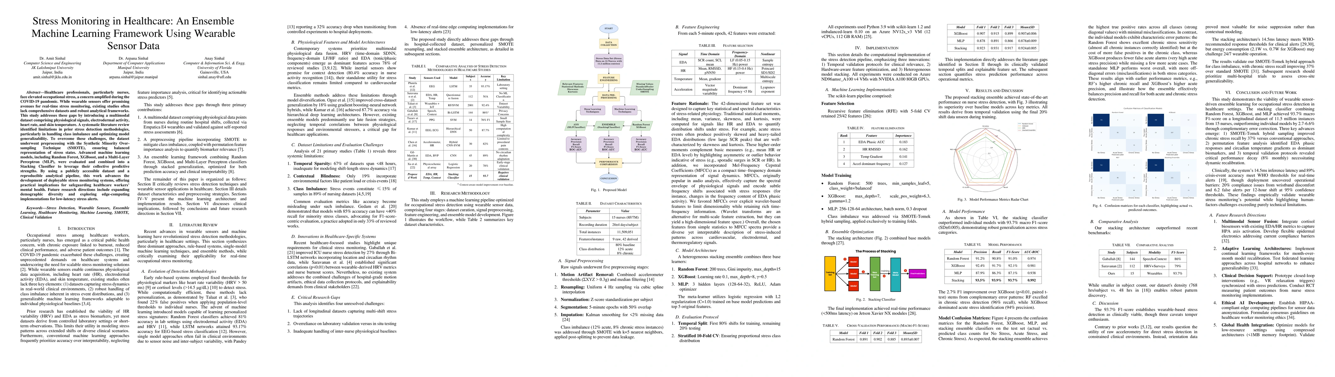 Healthcare professionals, particularly nurses, face elevated occupational stress, a concern amplified during the COVID-19 pandemic. While wearable sensors offer promising avenues for real-time stress monitoring, existing studies often lack comprehensive datasets and robust analytical frameworks. This study addresses these gaps by introducing a multimodal dataset comprising physiological signals, electrodermal activity, heart rate and skin temperature. A systematic literature review identified limitations in prior stress-detection methodologies, particularly in handling class imbalance and optimizing model generalizability. To overcome these challenges, the dataset underwent preprocessing with the Synthetic Minority Over sampling Technique (SMOTE), ensuring balanced representation of stress states. Advanced machine learning models including Random Forest, XGBoost and a Multi-Layer Perceptron (MLP) were evaluated and combined into a Stacking Classifier to leverage their collective predictive strengths. By using a publicly accessible dataset and a reproducible analytical pipeline, this work advances the development of deployable stress-monitoring systems, offering practical implications for safeguarding healthcare workers' mental health. Future research directions include expanding demographic diversity and exploring edge-computing implementations for low latency stress alerts.