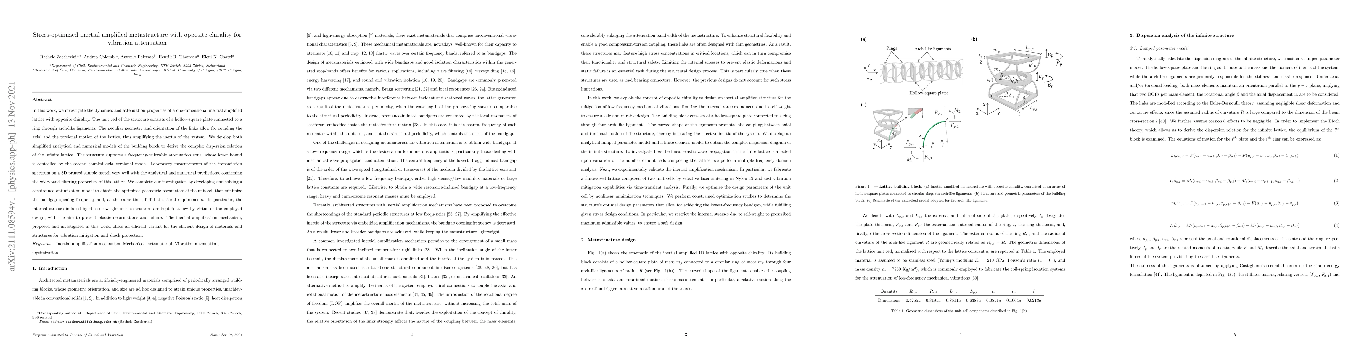 In this work, we investigate the dynamics and attenuation properties of a one-dimensional inertial amplified lattice with opposite chirality. The unit cell of the structure consists of a hollow-square plate connected to a ring through arch-like ligaments. The peculiar geometry and orientation of the links allow for coupling the axial and the torsional motion of the lattice, thus amplifying the inertia of the system. We develop both simplified analytical and numerical models of the building block to derive the complex dispersion relation of the infinite lattice. The structure supports a frequency-tailorable attenuation zone, whose lower bound is controlled by the second coupled axial-torsional mode. Laboratory measurements of the transmission spectrum on a 3D printed sample match very well with the analytical and numerical predictions, confirming the wide-band filtering properties of this lattice. We complete our investigation by developing and solving a constrained optimization model to obtain the optimized geometric parameters of the unit cell that minimize the bandgap opening frequency and, at the same time, fulfill structural requirements. In particular, the internal stresses induced by the self-weight of the structure are kept to a low by virtue of the employed design, with the aim to prevent plastic deformations and failure. The inertial amplification mechanism, proposed and investigated in this work, offers an efficient variant for the efficient design of materials and structures for vibration mitigation and shock protection.