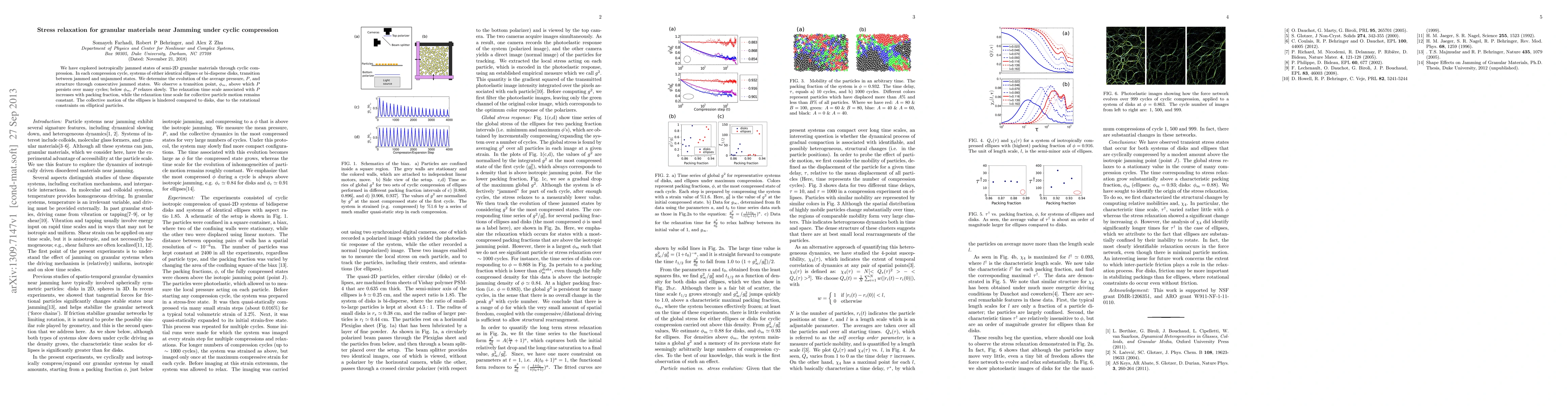 We have explored isotropically jammed states of semi-2D granular materials through cyclic compression. In each compression cycle, systems of either identical ellipses or bi-disperse disks, transition between jammed and unjammed states. We determine the evolution of the average pressure, P, and structure through consecutive jammed states. We observe a transition point, {\phi}m, above which P persists over many cycles; below {\phi}m, P relaxes slowly. The relaxation time scale associated with P increases with packing fraction, while the relaxation time scale for collective particle motion remains constant. The collective motion of the ellipses is hindered compared to disks, due to the rotational constraints on elliptical particles.