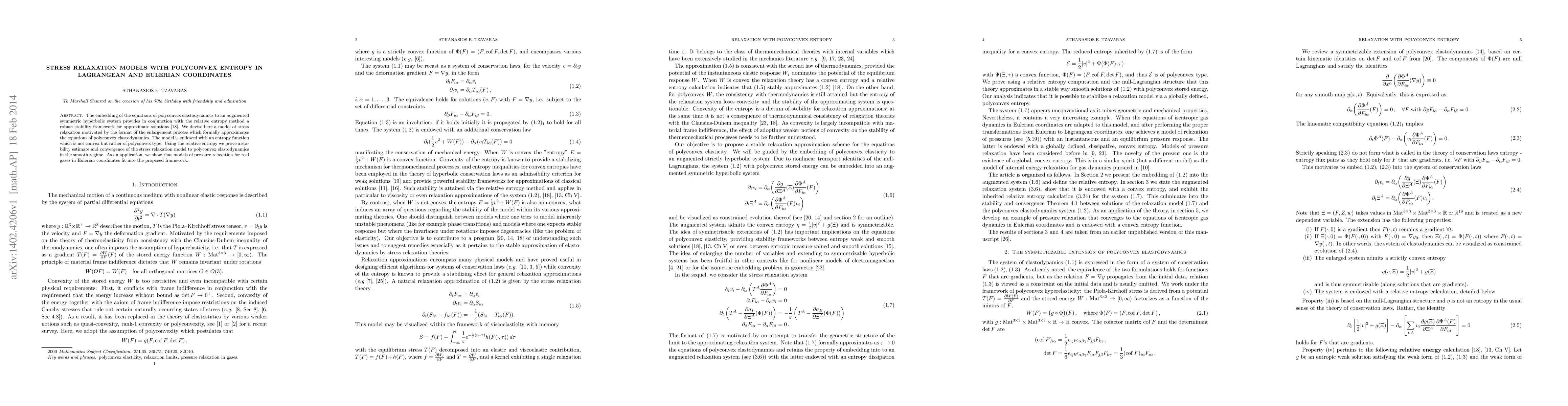 The embedding of the equations of polyconvex elastodynamics to an augmented symmetric hyperbolic system provides in conjunction with the relative entropy method a robust stability framework for approximate solutions. We devise here a model of stress relaxation motivated by the format of the enlargement process which formally approximates the equations of polyconvex elastodynamics. The model is endowed with an entropy function which is not convex but rather of polyconvex type. Using the relative entropy we prove a stability estimate and convergence of the stress relaxation model to polyconvex elastodynamics in the smooth regime. As an application, we show that models of pressure relaxation for real gases in Eulerian coordinates fit into the proposed framework.