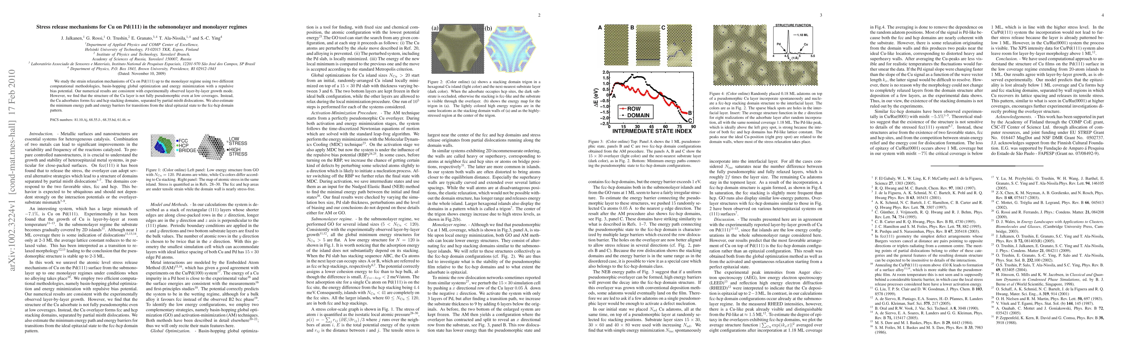 We study the strain relaxation mechanisms of Cu on Pd(111) up to the monolayer regime using two different computational methodologies, basin-hopping global optimization and energy minimization with a repulsive bias potential. Our numerical results are consistent with experimentally observed layer-by-layer growth mode. However, we find that the structure of the Cu layer is not fully pseudomorphic even at low coverages. Instead, the Cu adsorbates forms fcc and hcp stacking domains, separated by partial misfit dislocations. We also estimate the minimum energy path and energy barriers for transitions from the ideal epitaxial state to the fcc-hcp domain pattern.