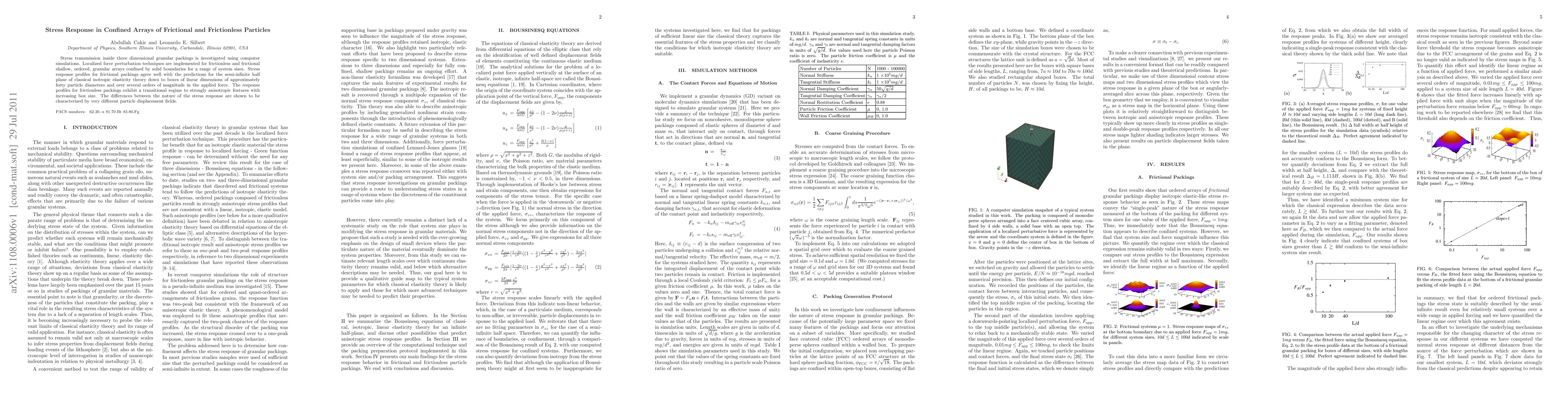 Stress transmission inside three dimensional granular packings is investigated using computer simulations. Localized force perturbation techniques are implemented for frictionless and frictional shallow, ordered, granular arrays confined by solid boundaries for a range of system sizes. Stress response profiles for frictional packings agree well with the predictions for the semi-infinite half plane of classical isotropic elasticity theory down to boxes of linear dimensions of approximately forty particle diameters and over several orders of magnitude in the applied force. The response profiles for frictionless packings exhibit a transitional regime to strongly anisotropic features with increasing box size. The differences between the nature of the stress response are shown to be characterized by very different particle displacement fields.
