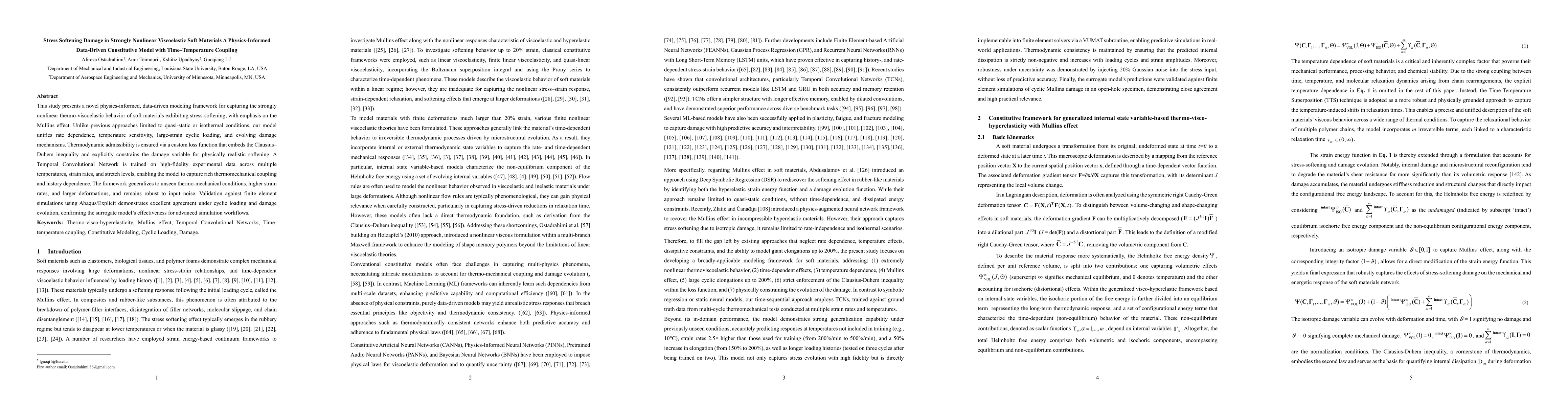 This study presents a novel physics informed, data-driven modeling framework for capturing the strongly nonlinear thermo-viscoelastic behavior of soft materials exhibiting stress softening, with emphasis on the Mullins effect. Unlike previous approaches limited to quasi-static or isothermal conditions, our model unifies rate dependence, temperature sensitivity, large strain cyclic loading, and evolving damage mechanisms. Thermodynamic admissibility is ensured via a custom loss function that embeds the Clausius Duhem inequality and explicitly constrains the damage variable for physically realistic softening. A Temporal Convolutional Network is trained on high fidelity experimental data across multiple temperatures, strain rates, and stretch levels, enabling the model to capture rich thermomechanical coupling and history dependence. The framework generalizes to unseen thermo mechanical conditions, higher strain rates, and larger deformations, and remains robust to input noise. Validation against finite element simulations using Abaqus/Explicit demonstrates excellent agreement under cyclic loading and damage evolution, confirming the surrogate models effectiveness for advanced simulation workflows.