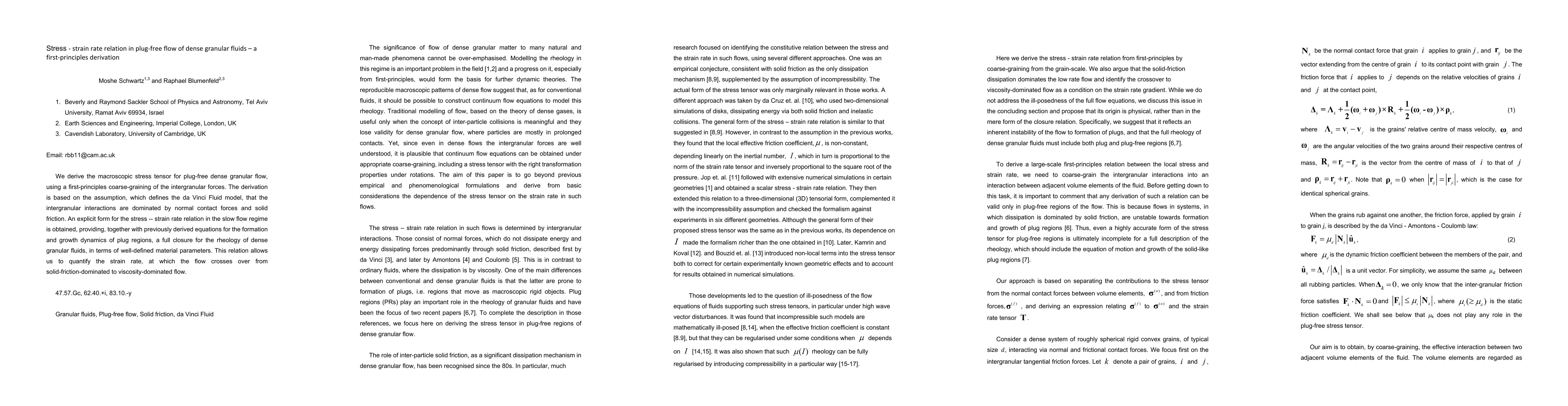 This paper derives a macroscopic stress tensor for plug-free dense granular flow using inter-granular force coarse-graining, establishing a stress-strain rate relation based on normal contact forces and solid friction. This provides a more accurate model for dense granular fluids compared to existing models.