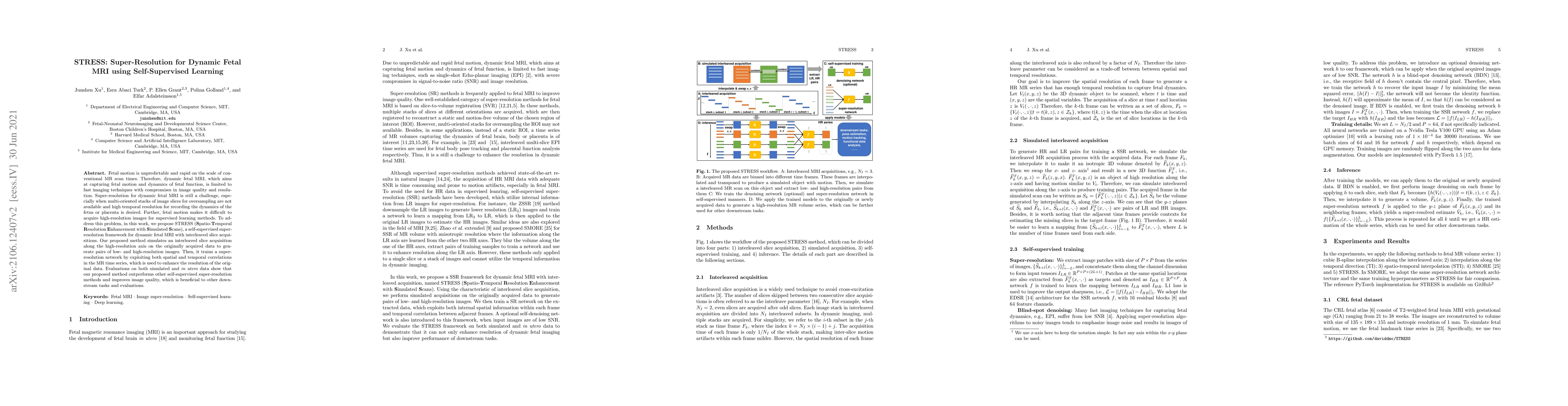 STRESS proposes a self-supervised super-resolution framework for enhancing dynamic fetal MRI resolution by simulating interleaved slice acquisitions. The method leverages spatial and temporal correlations in MR time series to improve image quality, outperforming other self-supervised methods in evaluations.