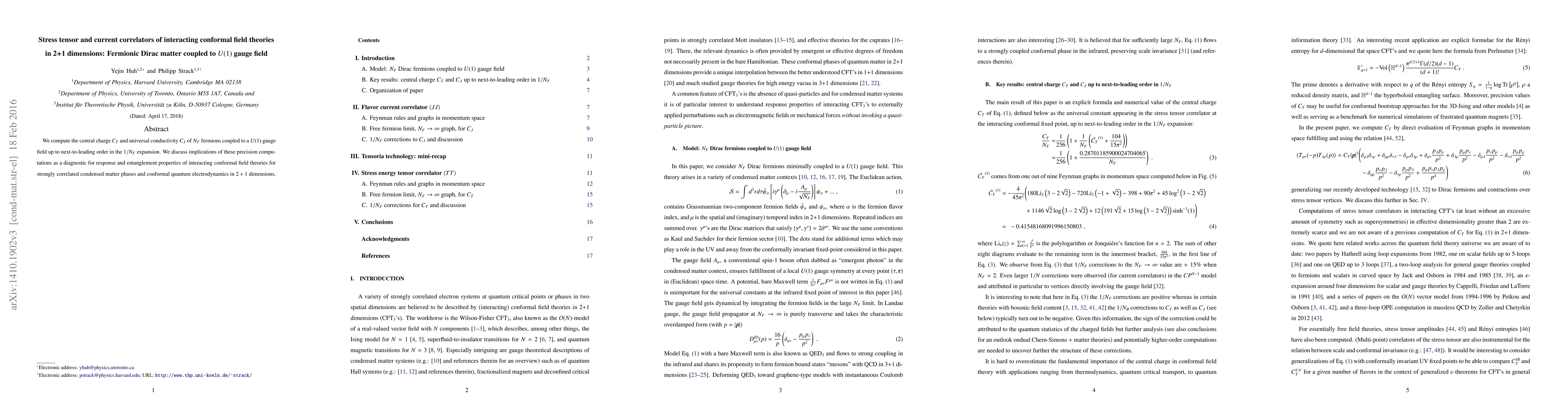 This paper computes the central charge $C_T$ and universal conductivity $C_J$ for $N_F$ fermions in a $U(1)$ gauge field up to next-to-leading order in the $1/N_F$ expansion, providing insights into the response and entanglement properties of interacting conformal field theories in $2+1$ dimensions. The results have implications for strongly correlated condensed matter systems and conformal quantum electrodynamics.