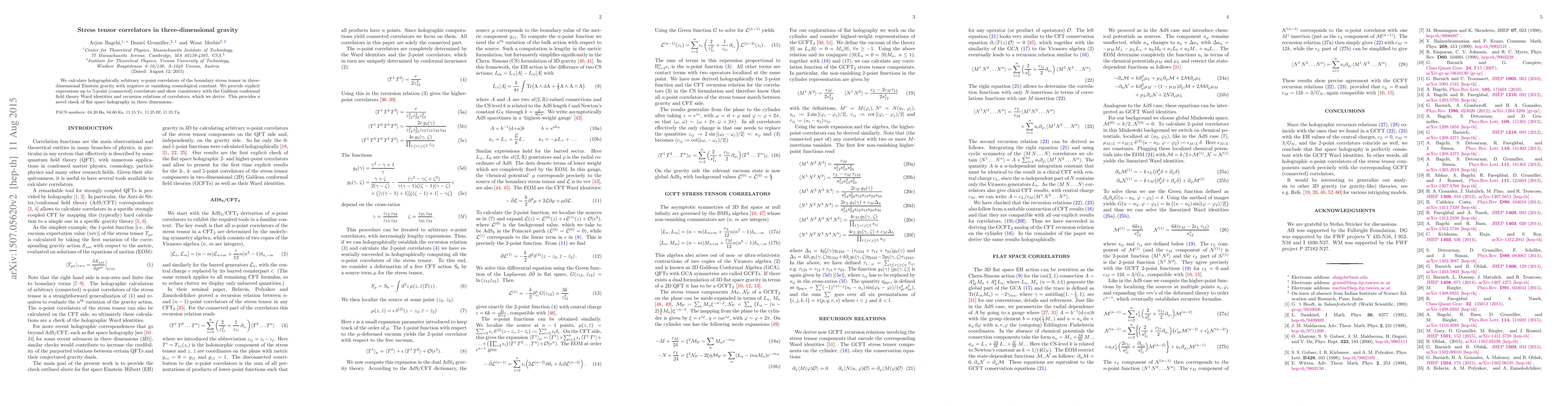 We calculate holographically arbitrary n-point correlators of the boundary stress tensor in three-dimensional Einstein gravity with negative or vanishing cosmological constant. We provide explicit expressions up to 5-point (connected) correlators and show consistency with the Galilean conformal field theory Ward identities and recursion relations of correlators, which we derive. This provides a novel check of flat space holography in three dimensions.
