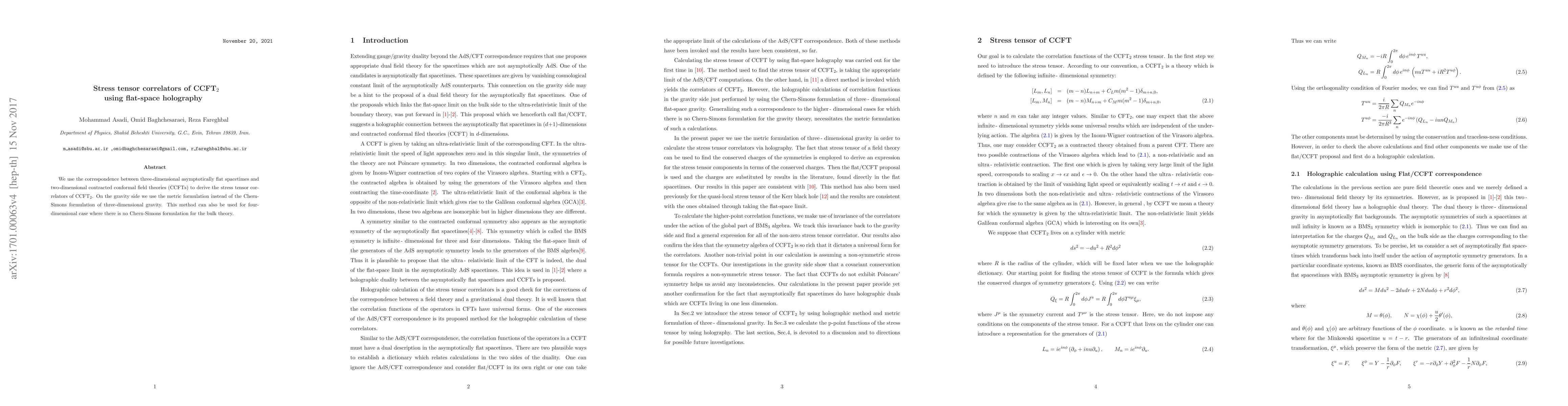 We use the correspondence between three-dimensional asymptotically flat spacetimes and two-dimensional contracted conformal field theories (CCFTs) to derive the stress tensor correlators of CCFT$_2$. On the gravity side we use the metric formulation instead of the Chern-Simons formulation of three-dimensional gravity. This method can also be used for four-dimensional case where there is no Chern-Simons formulation for the bulk theory.
