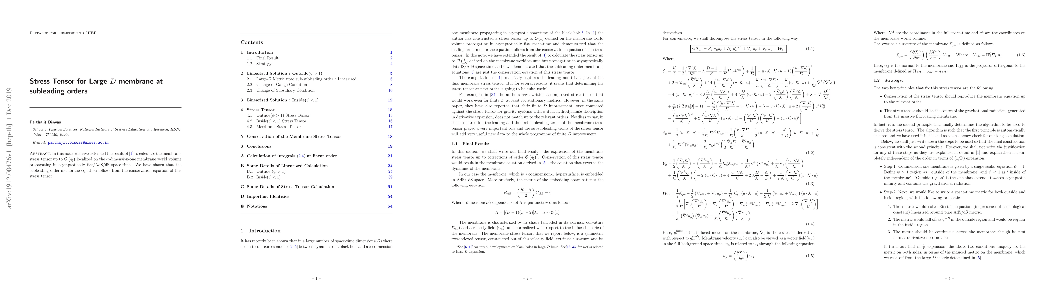 This paper extends the calculation of the membrane stress tensor to subleading orders in large-$D$ dimensions, showing that the subleading order membrane equation arises from the conservation of this stress tensor in asymptotically at/AdS/dS space-time. The results are localized on the codimension-one membrane world volume.