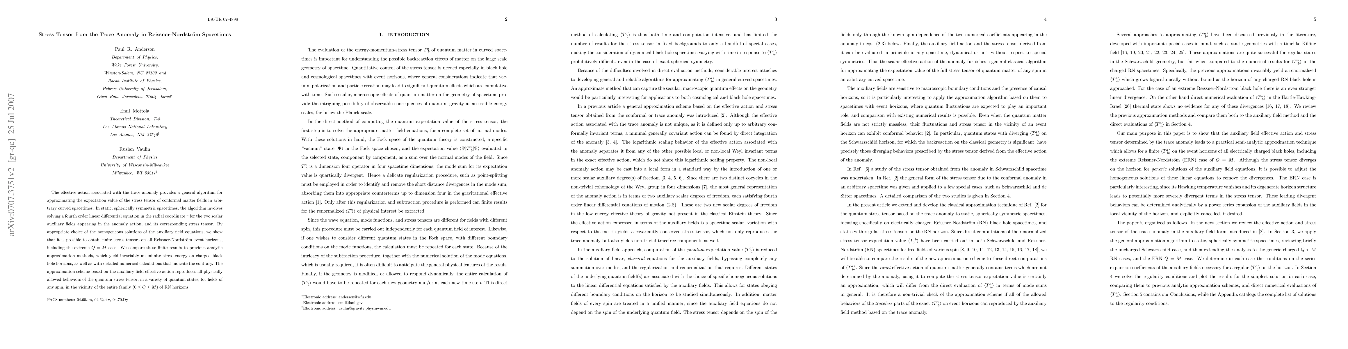 This paper develops a method to approximate the stress tensor of conformal matter fields in Reissner-Nordstrom spacetimes using the trace anomaly's effective action, showing finite stress tensors on all event horizons, including the extreme case, and comparing these results favorably against previous infinite stress-energy approximations.