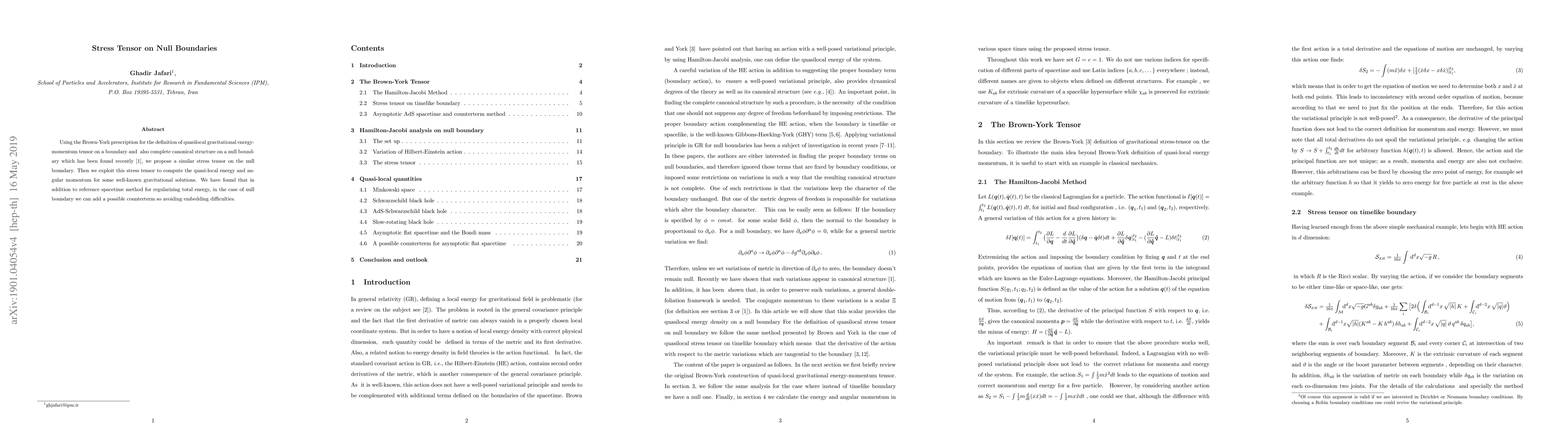 This paper proposes a quasilocal stress tensor on null boundaries using the Brown-York prescription and a recently discovered canonical structure. It computes quasi-local energy and angular momentum for known gravitational solutions, introducing an optional counterterm to avoid embedding difficulties.