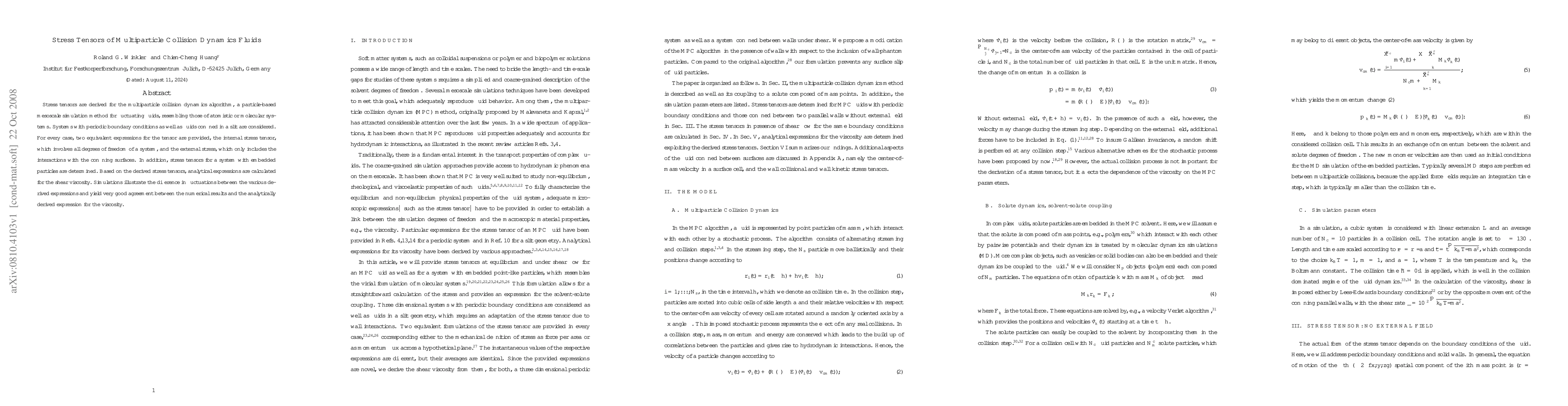 This paper derives stress tensors for multiparticle collision dynamics fluids, providing expressions for internal and external stresses. It also calculates shear viscosity analytically and demonstrates good agreement between numerical simulations and theoretical results.
