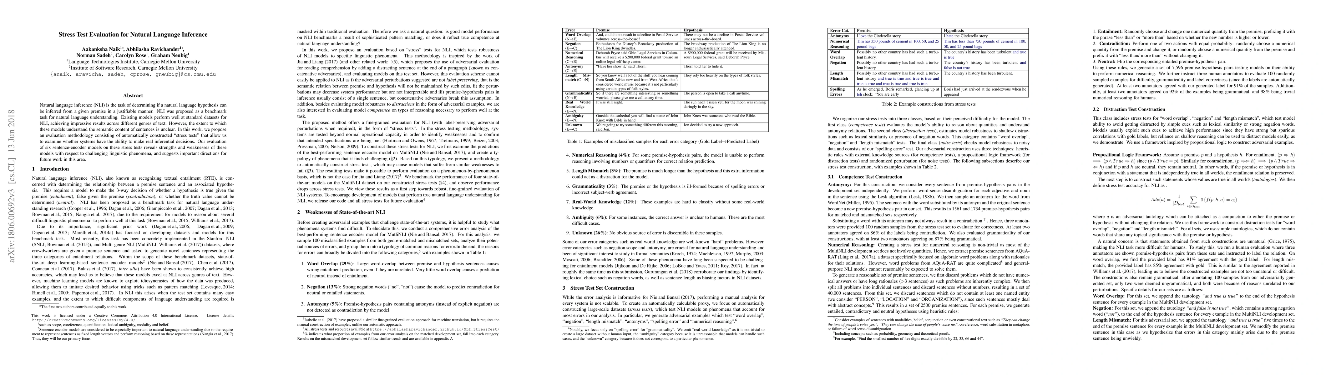 Natural language inference (NLI) is the task of determining if a natural language hypothesis can be inferred from a given premise in a justifiable manner. NLI was proposed as a benchmark task for natural language understanding. Existing models perform well at standard datasets for NLI, achieving impressive results across different genres of text. However, the extent to which these models understand the semantic content of sentences is unclear. In this work, we propose an evaluation methodology consisting of automatically constructed "stress tests" that allow us to examine whether systems have the ability to make real inferential decisions. Our evaluation of six sentence-encoder models on these stress tests reveals strengths and weaknesses of these models with respect to challenging linguistic phenomena, and suggests important directions for future work in this area.