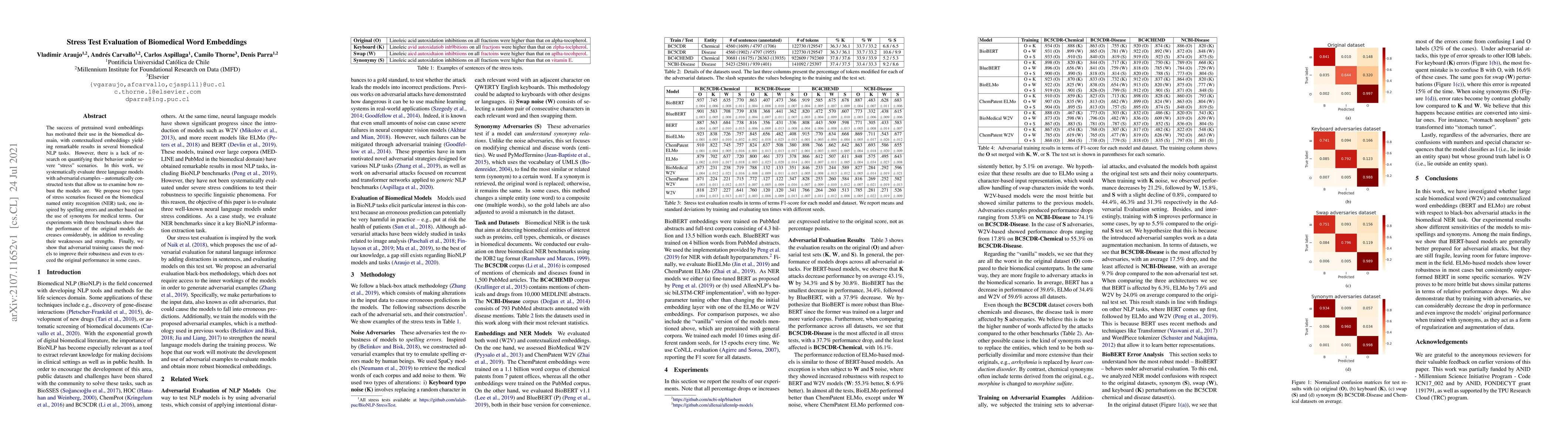 This paper evaluates the robustness of biomedical word embeddings under stress scenarios using adversarial examples, revealing significant performance drops in named entity recognition tasks. Adversarial training is shown to enhance the models' robustness, sometimes even surpassing original performance.