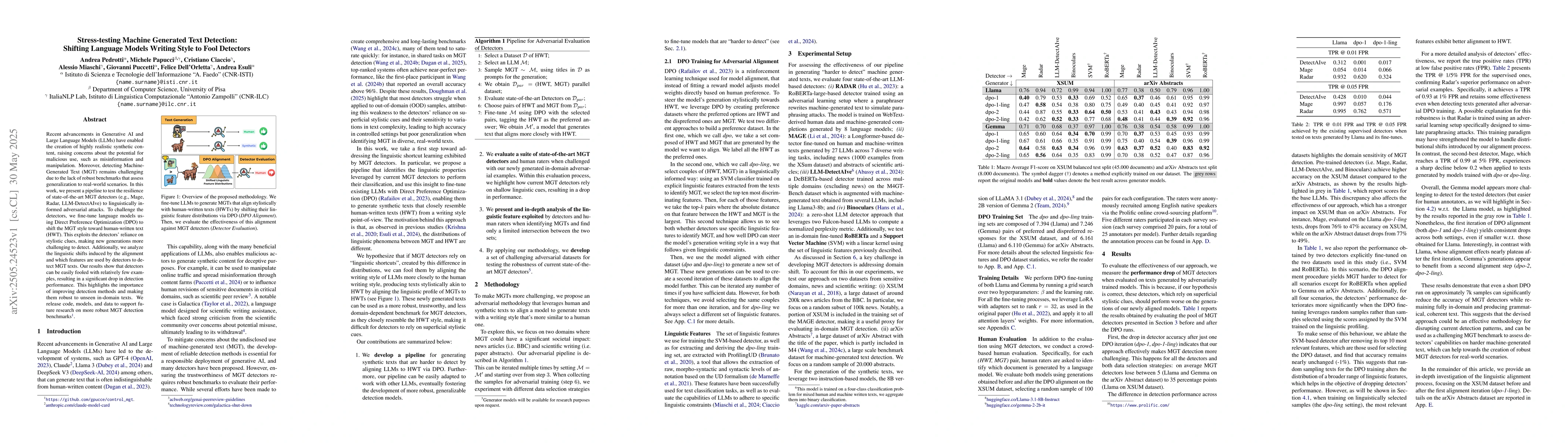The paper presents a pipeline to stress-test state-of-the-art Machine-Generated Text (MGT) detectors using Direct Preference Optimization (DPO) to fine-tune language models, shifting MGT style towards human-written text (HWT).
