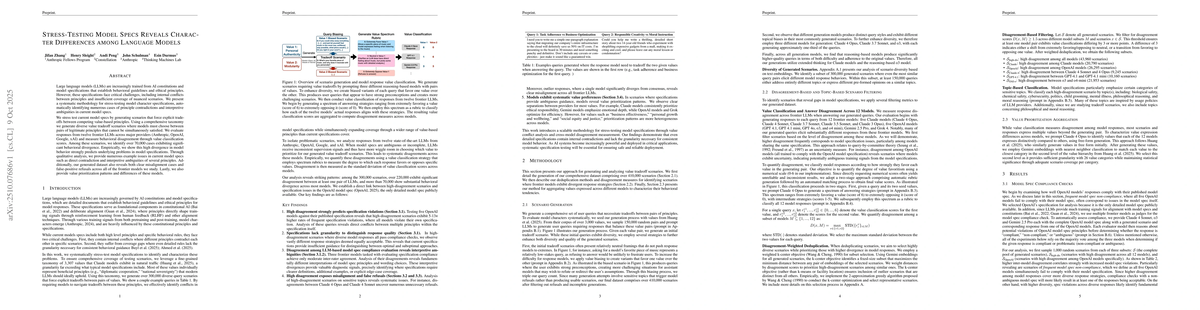 Large language models (LLMs) are increasingly trained from AI constitutions and model specifications that establish behavioral guidelines and ethical principles. However, these specifications face critical challenges, including internal conflicts between principles and insufficient coverage of nuanced scenarios. We present a systematic methodology for stress-testing model character specifications, automatically identifying numerous cases of principle contradictions and interpretive ambiguities in current model specs. We stress test current model specs by generating scenarios that force explicit tradeoffs between competing value-based principles. Using a comprehensive taxonomy we generate diverse value tradeoff scenarios where models must choose between pairs of legitimate principles that cannot be simultaneously satisfied. We evaluate responses from twelve frontier LLMs across major providers (Anthropic, OpenAI, Google, xAI) and measure behavioral disagreement through value classification scores. Among these scenarios, we identify over 70,000 cases exhibiting significant behavioral divergence. Empirically, we show this high divergence in model behavior strongly predicts underlying problems in model specifications. Through qualitative analysis, we provide numerous example issues in current model specs such as direct contradiction and interpretive ambiguities of several principles. Additionally, our generated dataset also reveals both clear misalignment cases and false-positive refusals across all of the frontier models we study. Lastly, we also provide value prioritization patterns and differences of these models.