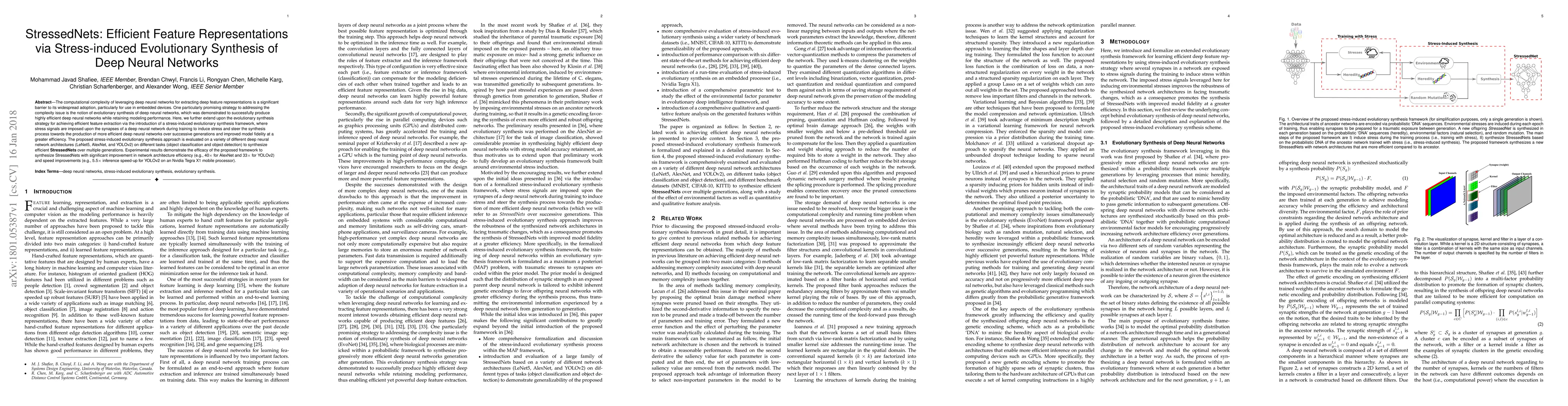 The computational complexity of leveraging deep neural networks for extracting deep feature representations is a significant barrier to its widespread adoption, particularly for use in embedded devices. One particularly promising strategy to addressing the complexity issue is the notion of evolutionary synthesis of deep neural networks, which was demonstrated to successfully produce highly efficient deep neural networks while retaining modeling performance. Here, we further extend upon the evolutionary synthesis strategy for achieving efficient feature extraction via the introduction of a stress-induced evolutionary synthesis framework, where stress signals are imposed upon the synapses of a deep neural network during training to induce stress and steer the synthesis process towards the production of more efficient deep neural networks over successive generations and improved model fidelity at a greater efficiency. The proposed stress-induced evolutionary synthesis approach is evaluated on a variety of different deep neural network architectures (LeNet5, AlexNet, and YOLOv2) on different tasks (object classification and object detection) to synthesize efficient StressedNets over multiple generations. Experimental results demonstrate the efficacy of the proposed framework to synthesize StressedNets with significant improvement in network architecture efficiency (e.g., 40x for AlexNet and 33x for YOLOv2) and speed improvements (e.g., 5.5x inference speed-up for YOLOv2 on an Nvidia Tegra X1 mobile processor).