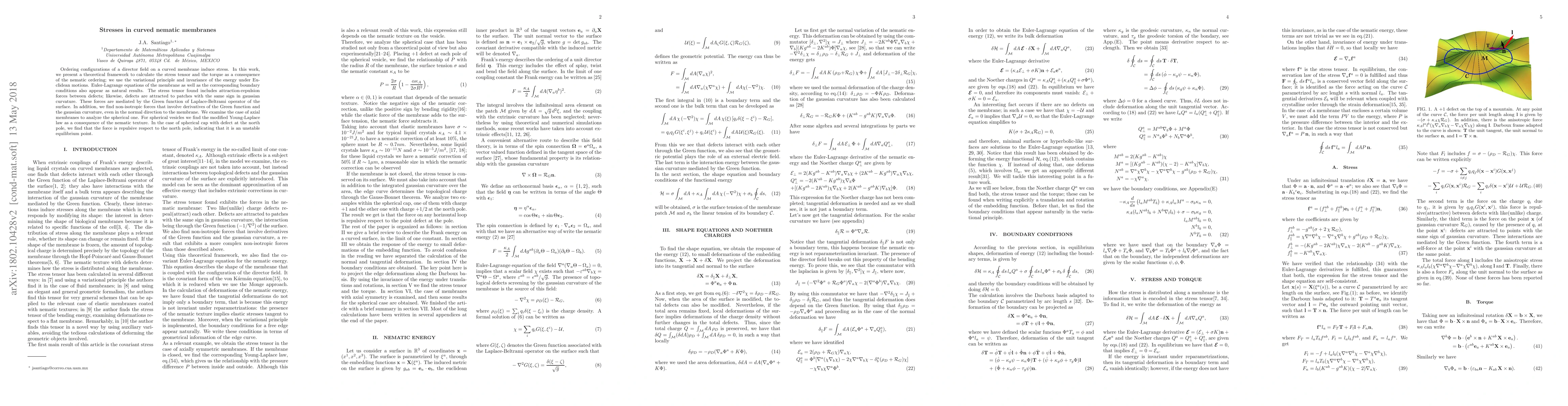 Researchers developed a theoretical framework to calculate stress and torque in curved nematic membranes, revealing attraction-repulsion forces between defects and non-isotropic forces that involve derivatives of the Green function and Gaussian curvature.