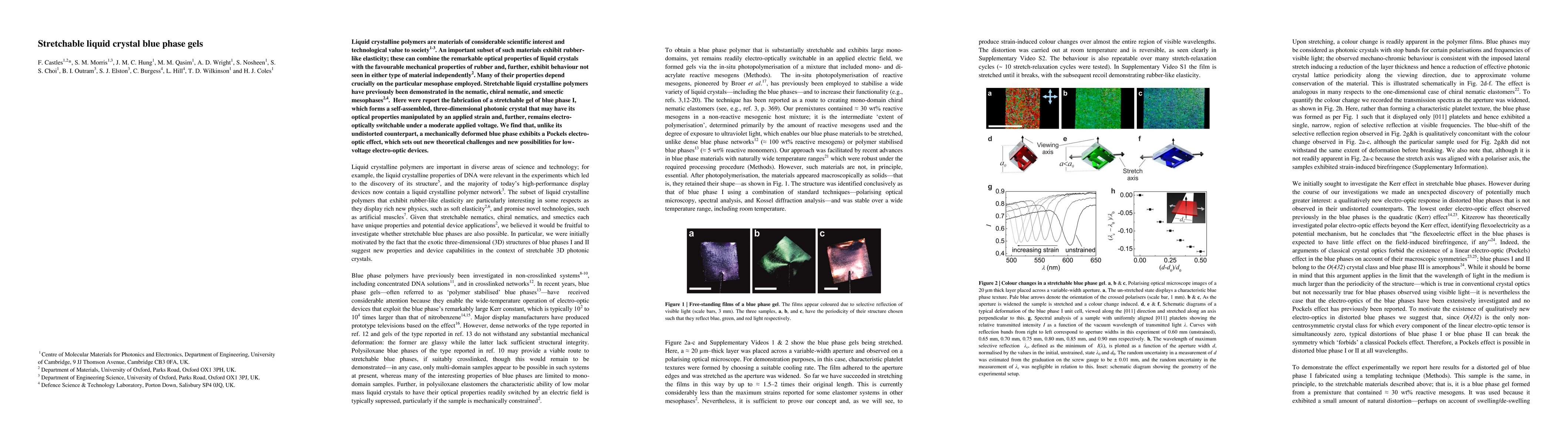 This paper reports the fabrication of a stretchable liquid crystal blue phase gel that combines rubber-like elasticity with unique optical properties. The deformed blue phase exhibits a Pockels electro-optic effect, opening new avenues for low-voltage electro-optic devices.