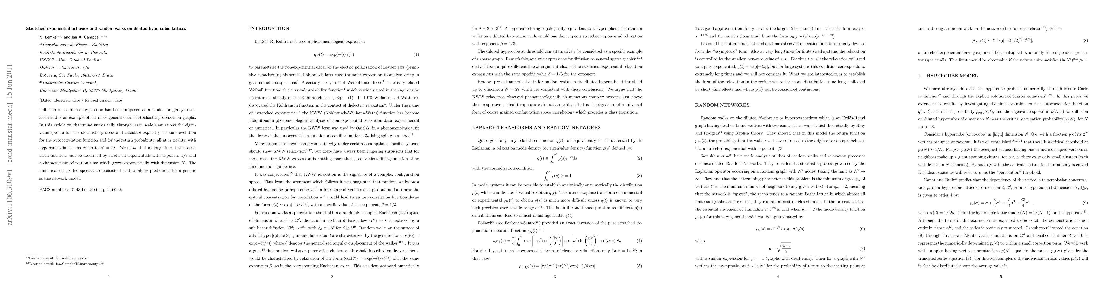 Diffusion on a diluted hypercube has been proposed as a model for glassy relaxation and is an example of the more general class of stochastic processes on graphs. In this article we determine numerically through large scale simulations the eigenvalue spectra for this stochastic process and calculate explicitly the time evolution for the autocorrelation function and for the return probability, all at criticality, with hypercube dimensions $N$ up to N=28. We show that at long times both relaxation functions can be described by stretched exponentials with exponent 1/3 and a characteristic relaxation time which grows exponentially with dimension $N$. The numerical eigenvalue spectra are consistent with analytic predictions for a generic sparse network model.