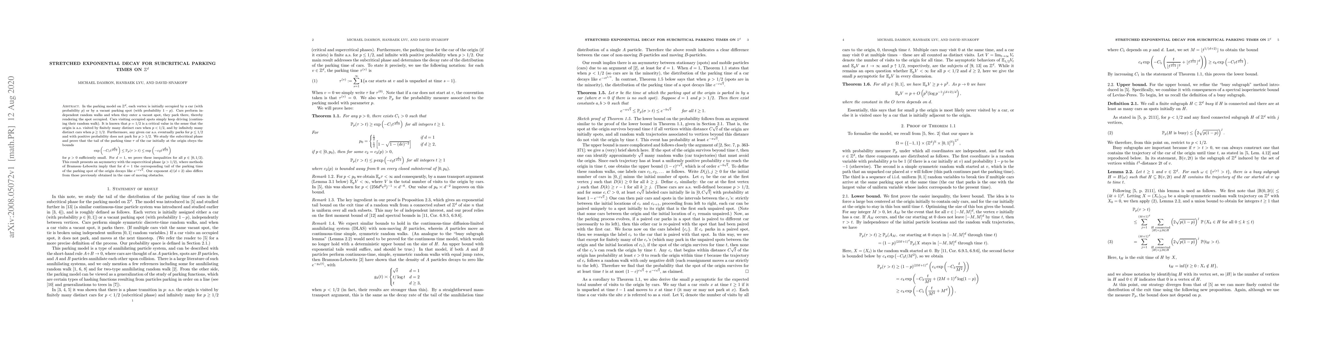 In the parking model on $\mathbb{Z}^d$, each vertex is initially occupied by a car (with probability $p$) or by a vacant parking spot (with probability $1-p$). Cars perform independent random walks and when they enter a vacant spot, they park there, thereby rendering the spot occupied. Cars visiting occupied spots simply keep driving (continuing their random walk). It is known that $p=1/2$ is a critical value in the sense that the origin is a.s. visited by finitely many distinct cars when $p<1/2$, and by infinitely many distinct cars when $p\geq 1/2$. Furthermore, any given car a.s. eventually parks for $p \leq 1/2$ and with positive probability does not park for $p > 1/2$. We study the subcritical phase and prove that the tail of the parking time $\tau$ of the car initially at the origin obeys the bounds \[ \exp\left( - C_1 t^{\frac{d}{d+2}}\right) \leq \mathbb{P}_p(\tau > t) \leq \exp\left( - c_2 t^{\frac{d}{d+2}}\right) \] for $p>0$ sufficiently small. For $d=1$, we prove these inequalities for all $p \in [0,1/2)$. This result presents an asymmetry with the supercritical phase ($p>1/2$), where methods of Bramson--Lebowitz imply that for $d=1$ the corresponding tail of the parking time of the parking spot of the origin decays like $e^{-c\sqrt{t}}$. Our exponent $d/(d+2)$ also differs from those previously obtained in the case of moving obstacles.