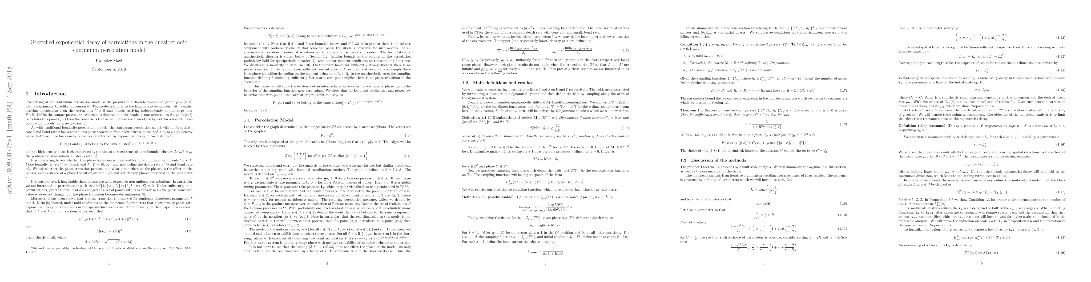 Summary: This paper investigates the continuum percolation model with quasiperiodically disordered fields, demonstrating stretched exponential decay of correlations under intermediate disorder strengths, contrasting with the oriented contact process.