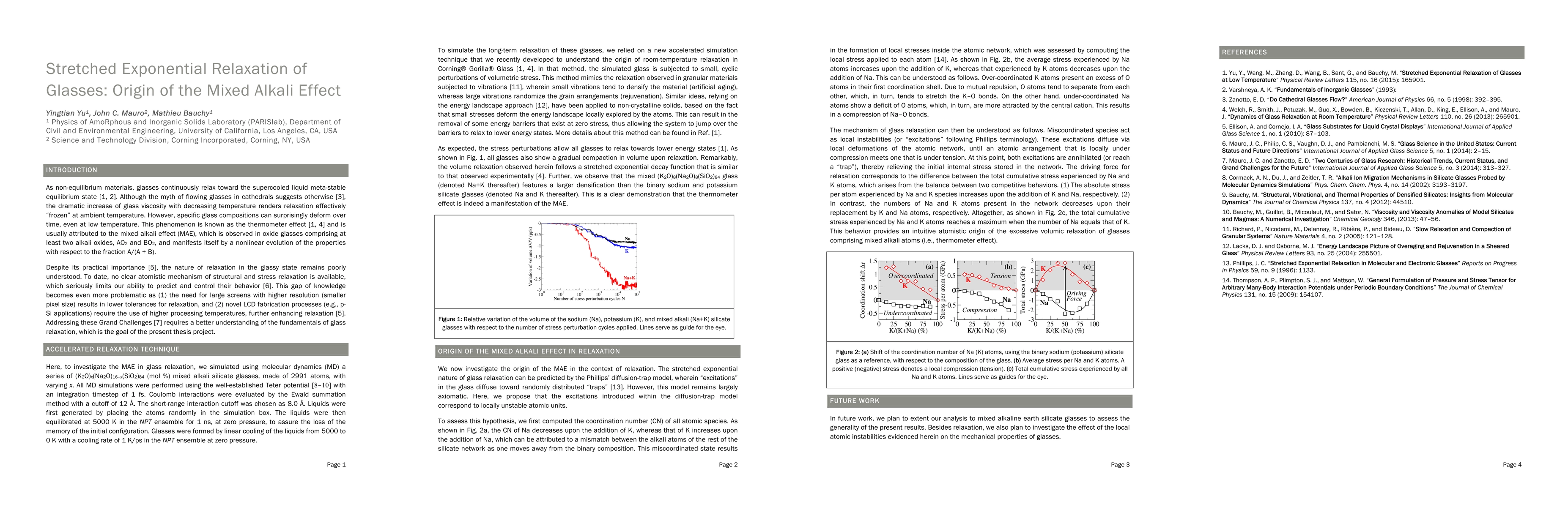 Although it is indeed commonly believed that, as frozen supercooled liquids, glasses should continue to flow over the years (e.g., in the case of the stained-glass windows of medieval cathedrals), the dramatic increase of their viscosity below the glass transition temperature suggests, on the contrary, that their relaxation time is on the order of 10$^{32}$ years at room temperature. However, a recent study conducted by Mauro et al. reported the intriguing dynamics of the relaxation of a commercial Corning Gorilla Glass at room temperature, over 1.5 years. Here, we report a novel atomistic simulation method allowing us to directly access the long-term (years) dynamics of glass relaxation at room temperature. Based on the simulation of a series of mixed alkali silicate glasses, we demonstrate that room-temperature relaxation is a direct consequence of the mixed alkali effect. Although both volume and energy feature a stretched exponential relaxation, our results reveal a bifurcation of the stretching exponents, with $\beta$ = 3/5 and 3/7 for energy and volume relaxation, respectively. Relaxation is found to occur through the diffusion of local stressed structural instabilities inside the atomic network, which anneal each other when a compressed atomic unit meets one that is under tension. The driving force for such diffusion-trap relaxation mechanism is found to be at a maximum when the concentrations of each alkali atom equal each other, which arises from a balance between the concentration of each alkali atom and the magnitude of the local stress that they undergo.