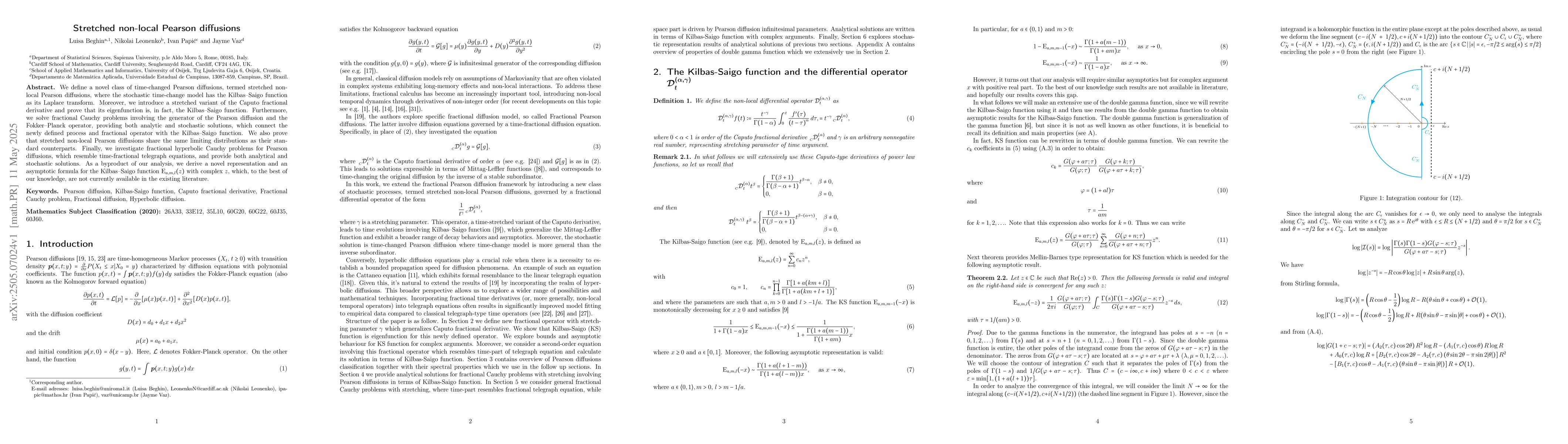 The introduction of stretched non-local Pearson diffusions, a stretched variant of the Caputo fractional derivative, and the derivation of novel representations and asymptotic formulas for the Kilbas Saigo function.
