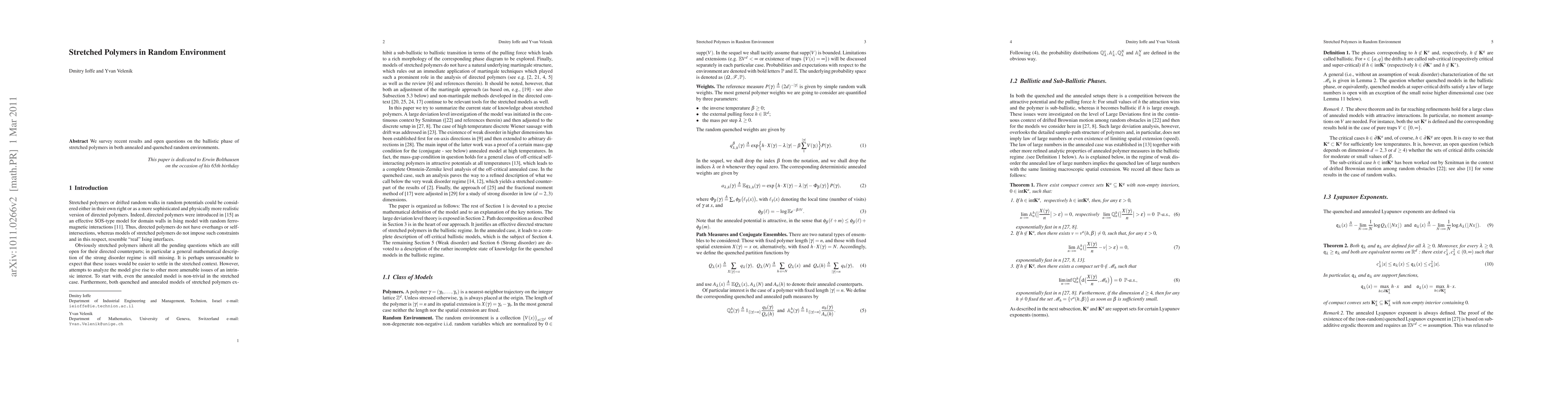 We survey recent results and open questions on the ballistic phase of stretched polymers in both annealed and quenched random environments.