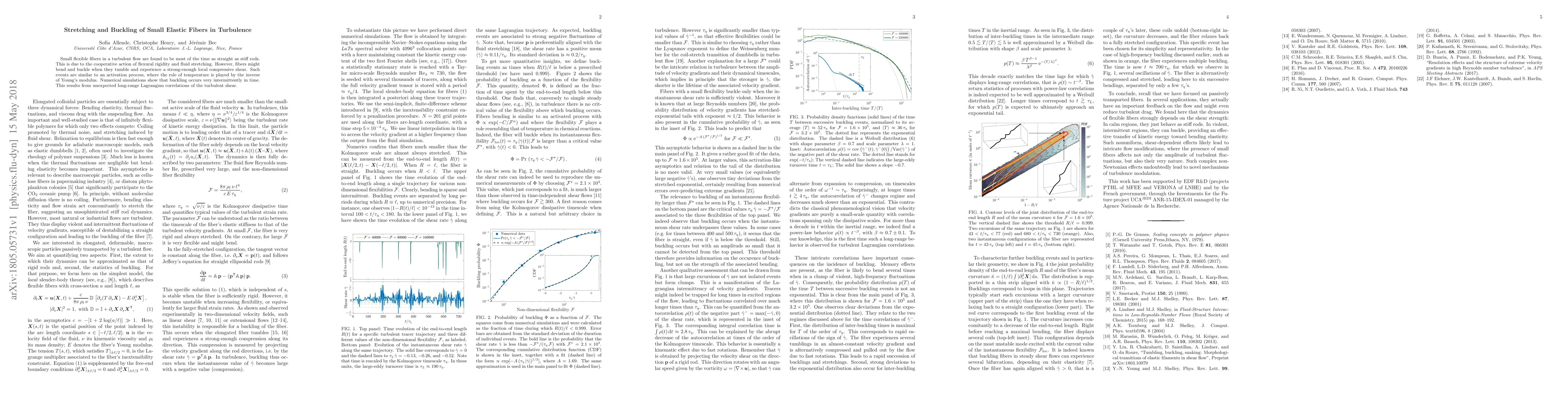 Small elastic fibers in turbulent flows tend to remain straight due to flexural rigidity and fluid stretching, but can bend and buckle under strong compressive shear, a process similar to an activation event driven by the inverse of Young's modulus.