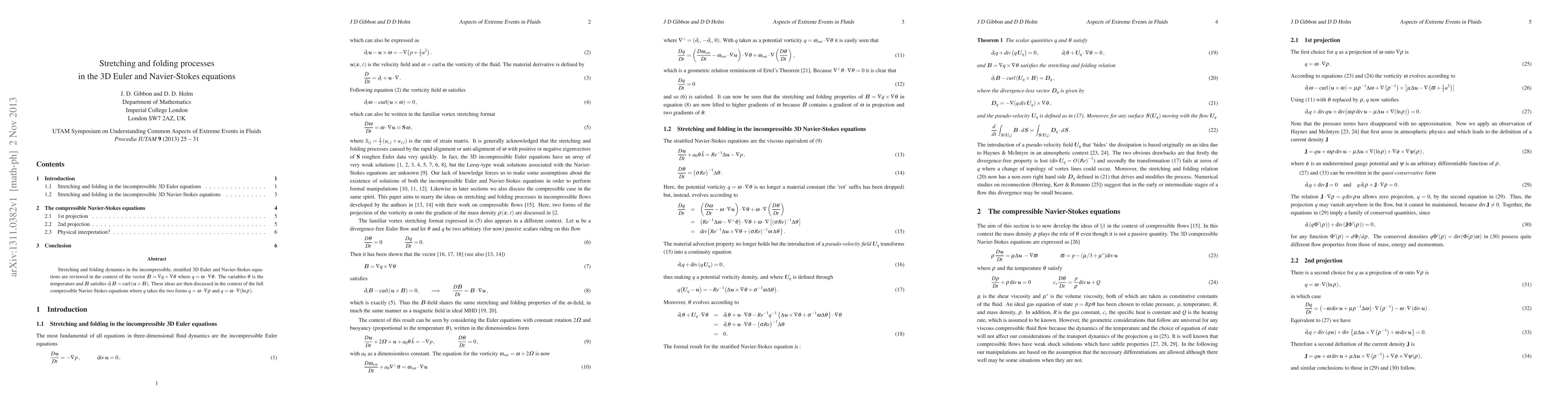 Stretching and folding dynamics in the incompressible, stratified 3D Euler and Navier-Stokes equations are reviewed in the context of the vector $\bdB = \nabla q\times\nabla\theta$ where $q=\bom\cdot\nabla\theta$. The variable $\theta$ is the temperature and $\bdB$ satisfies $\partial_{t}\bdB = \mbox{curl}\,(\bu\times\bdB)$. These ideas are then discussed in the context of the full compressible Navier-Stokes equations where $q$ takes the two forms $q = \bom\cdot\nabla\rho$ and $q = \bom\cdot\nabla(\ln\rho)$.