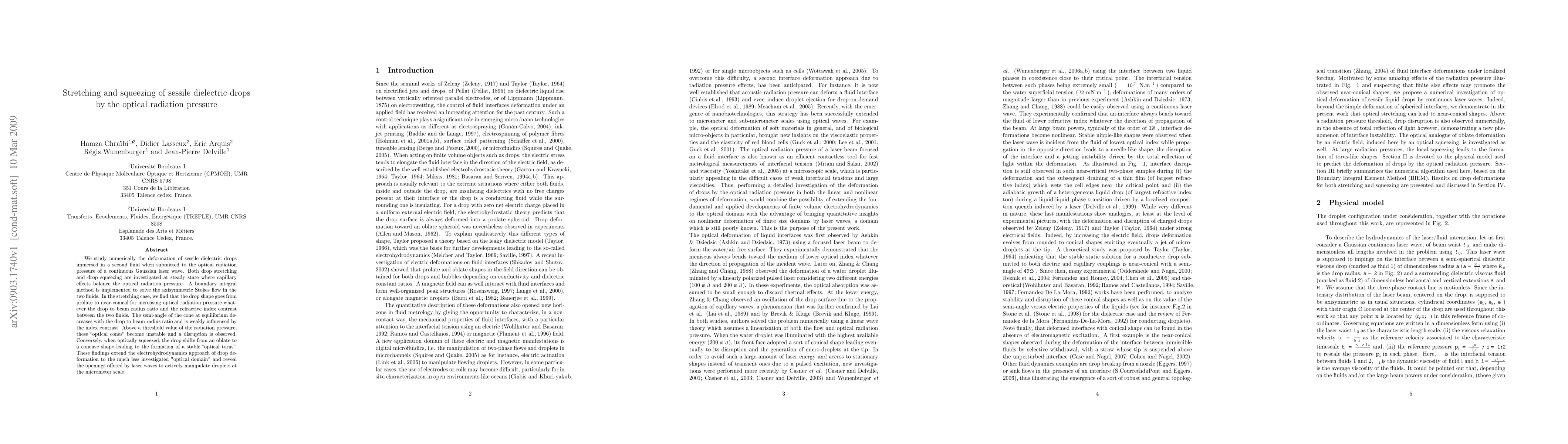 We study numerically the deformation of sessile dielectric drops immersed in a second fluid when submitted to the optical radiation pressure of a continuous Gaussian laser wave. Both drop stretching and drop squeezing are investigated at steady state where capillary effects balance the optical radiation pressure. A boundary integral method is implemented to solve the axisymmetric Stokes flow in the two fluids. In the stretching case, we find that the drop shape goes from prolate to near-conical for increasing optical radiation pressure whatever the drop to beam radius ratio and the refractive index contrast between the two fluids. The semi-angle of the cone at equilibrium decreases with the drop to beam radius ratio and is weakly influenced by the index contrast. Above a threshold value of the radiation pressure, these "optical cones" become unstable and a disruption is observed. Conversely, when optically squeezed, the drop shifts from an oblate to a concave shape leading to the formation of a stable "optical torus". These findings extend the electrohydrodynamics approach of drop deformation to the much less investigated "optical domain" and reveal the openings offered by laser waves to actively manipulate droplets at the micrometer scale.