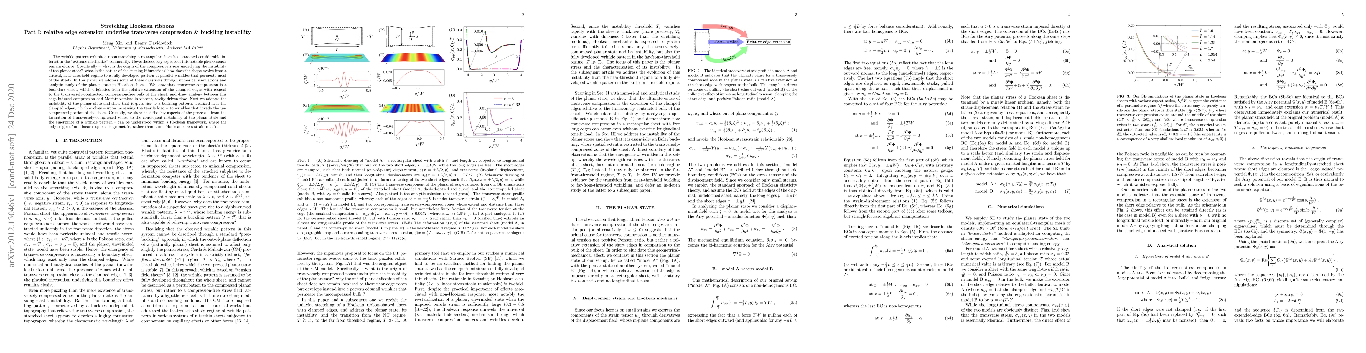 The wrinkle pattern exhibited upon stretching a rectangular sheet has attracted considerable interest in the "extreme mechanics" community. Nevertheless, key aspects of this notable phenomenon remain elusive. Specifically -- what is the origin of the compressive stress underlying the instability of the planar state? what is the nature of the ensuing bifurcation? how does the shape evolve from a critical, near-threshold regime to a fully-developed pattern of parallel wrinkles that permeate most of the sheet? In this paper we address some of these questions through numerical simulations and analytic study of the planar state in Hooekan sheets. We show that transverse compression is a boundary effect, which originates from the relative extension of the clamped edges with respect to the transversely-contracted, compression-free bulk of the sheet, and draw analogy between this edge-induced compression and Moffatt vortices in viscous, cavity-driven flow. Next we address the instability of the planar state and show that it gives rise to a buckling pattern, localized near the clamped edges, which evolves -- upon increasing the tensile load -- to wrinkles that invade the uncompressed portion of the sheet. Crucially, we show that the key aspects of the process -- from the formation of transversely-compressed zones, to the consequent instability of the planar state and the emergence of a wrinkle pattern -- can be understood within a Hookean framework, where the only origin of nonlinear response is geometric, rather than a non-Hookean stress-strain relation.